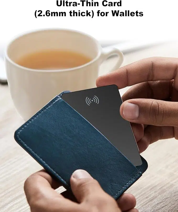 Die RUIZHI-Karte setzt hier auf das Kreditkartenformat. Sie ist zwar mit knapp 2.6 mm etwas dicker als eine Visa-Karte, verschwindet aber dennoch deutlich eleganter im Kartenfach als jeder Schlüsselanhänger-Tracker. Das Design ist schlicht, schwarz und funktional. Keinen Designpreis verdächtig, aber in der Geldbörse sieht es ja ohnehin niemand.