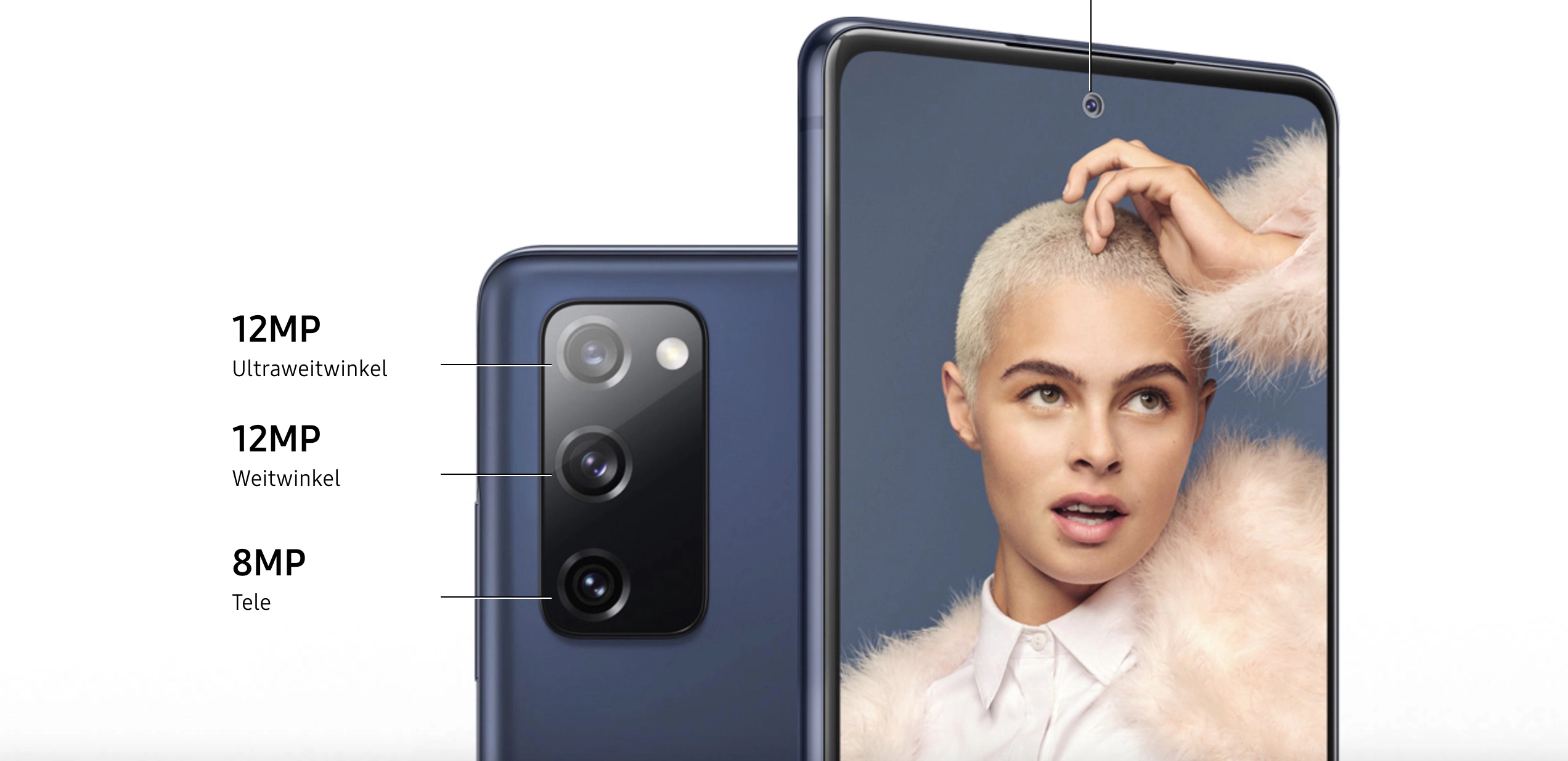 Das Galaxy S20 FE setzt auf eine Triple-Kamera mit dem „idealen“ Setup. 12 Megapixel Hauptkamera mit ƒ/1.8 Blende, 12 Megapixel Ultraweitwinkel mit ƒ/2.2 Blende und sogar eine Zoom-Kamera mit ƒ/2.4 Blende. Die ist damit nicht ganz so lichtstark und bietet auch nur eine 8 Megapixel Auflösung, dafür aber einen 3-fach optischen Zoom. Auf der Vorderseite knipst man mit 32 Megapixeln.