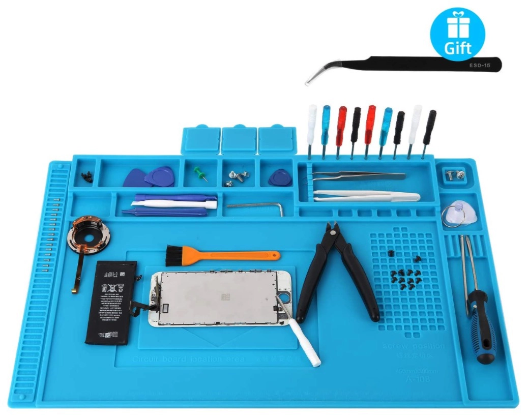 Silikon-Arbeitsmatten wie diese sind ein nützliches Gadget für jede Art von Bastler. Egal ob die einfach Variante oder die mit einigen extra Fächern ausgestattete Ausgabe mit Magnetfeldern, sie helfen euch eure Werkzeuge und Kleinteile beisammen zu halten.
