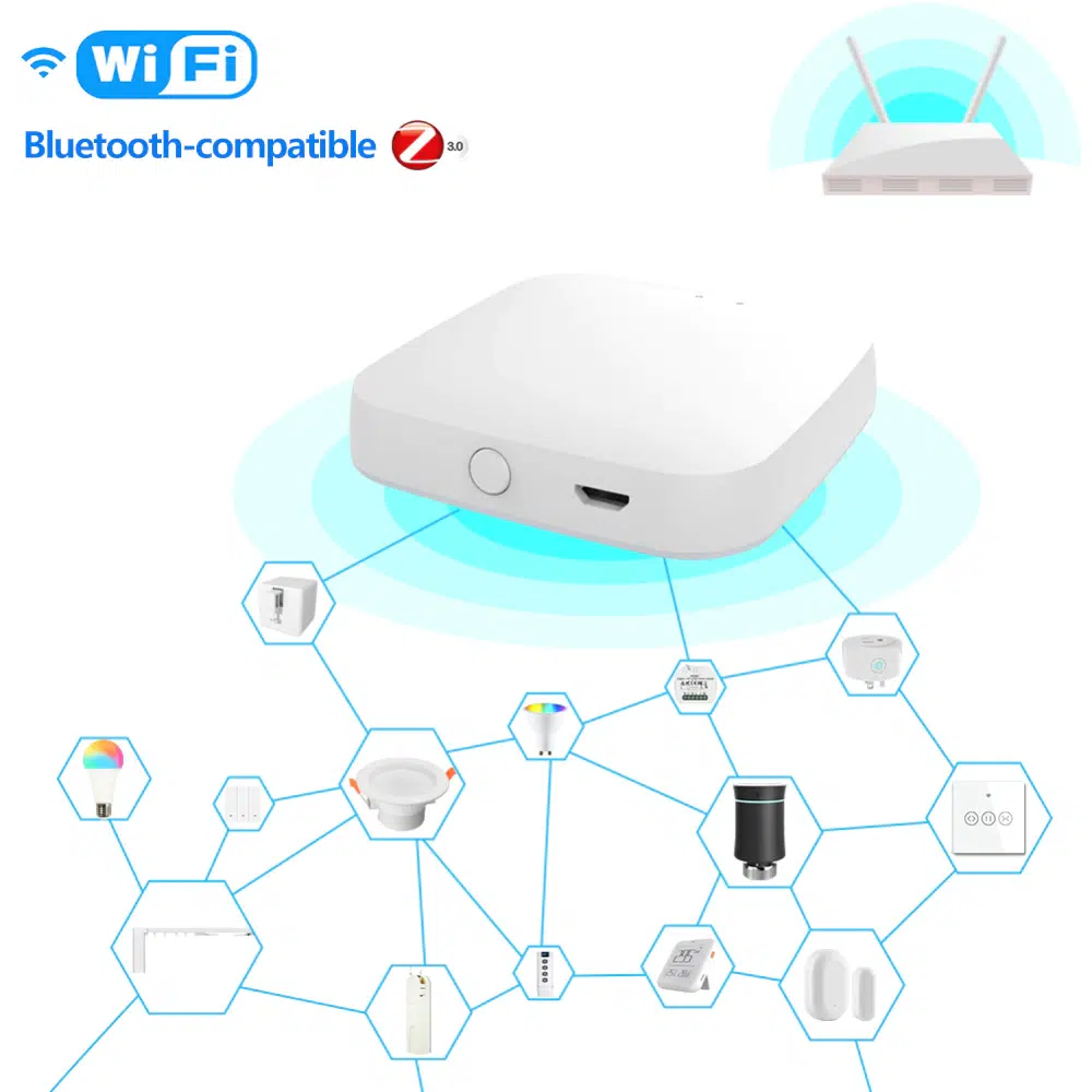 Für das Herzstück des Smart Home wählt Erika einen günstigen Tuya ZigBee 3.0 Hub, der multimodal ist. Soll heißen: Er unterstützt gleich mehrere Protokolle. So kommuniziert er mit ZigBee-Geräten (3.0 und abwärtskompatibel) und mit Bluetooth SIG-Endgeräten. Wenn Erika also später beispielsweise den Tuya Smart Bluetooth Fingerbot Schalter kaufen möchte, dann kann sie ihn direkt mit ihrem Hub verbinden. Letzter sorgt dank WLAN dann für die Einbindung ins heimische Netzwerk und ermöglicht es den Mustermanns zukünftig auch, WLAN-basierte Tuya-Geräte in ihr bestehendes Smart Home zu integrieren.