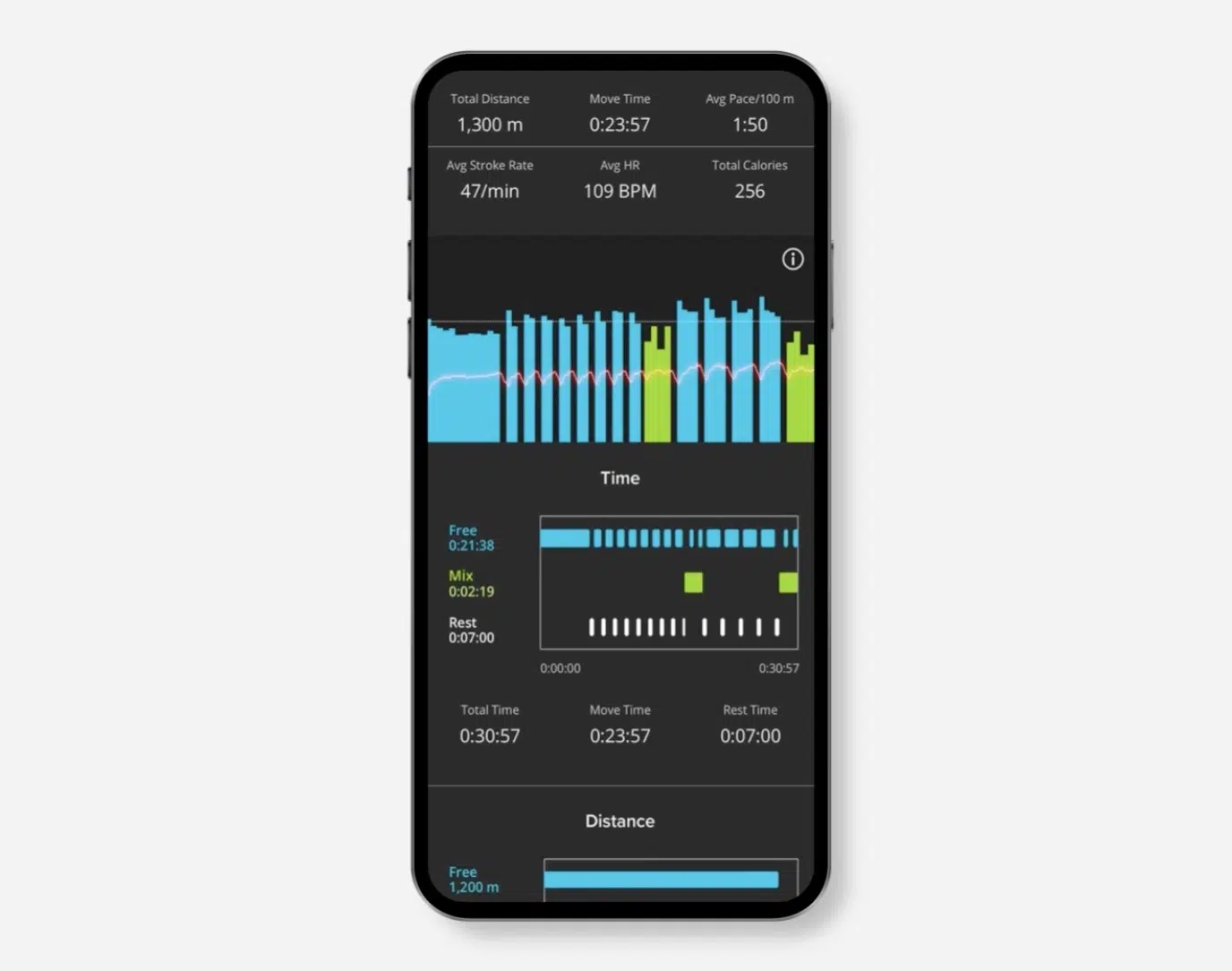 Falls ihr mal außerhalb des städtischen Schwimmbads trainieren wollt: Packt eure Smartwatch ein. Im See können nicht alle Daten ohne eine Kopplung gesammelt werden. Für die Anzahl eurer Schwimmzüge, die Distanz pro Schwimmzug und das gleichmäßige Tempo braucht ihr in diesem Fall eine Verbindung zu eurer Smartwatch. Der Hersteller nennt hier explizit die Uhren von Apple und Garmin als kompatible Geräte.