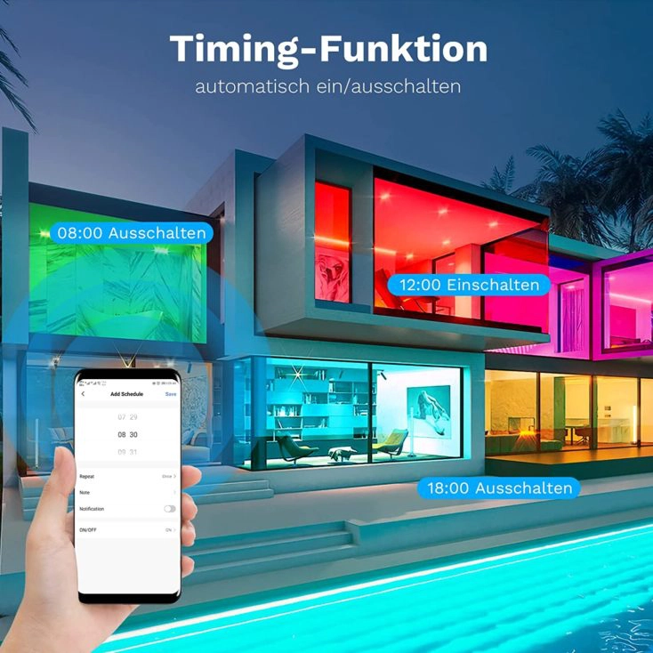 Über die App lässt sich auch ein Dimmer einstellen, mit diesem kann das Licht stufenlos gedimmt werden. Mit verschiedenen Zeitplänen kann die Lampe zu bestimmten Zeiten ein- und ausgestellt werden. Demzufolge kann man die Stehleuchte an seinen Tagesrhythmus anpassen und sie z.B. als Nachtlicht benutzen. Beim Ausschalten der Lampe wird der letzte Modus gespeichert, so spart man sich etwas Zeit.