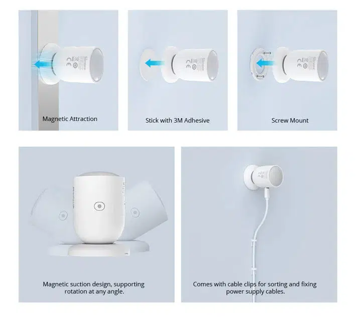 Sonst gibt es nur einen USB-C Slot. Letzterer ist nicht etwa zum Aufladen, sondern zum Anschluss eines Stromkabels. Grund: mmWave-Sensoren brauchen mehr Strom (in diesem Fall: 1A bei 5V) als ihre PIR-Kollegen. Deshalb liegt im Lieferumfang auch ein ca. 2m langes USB-Kabel nebst Befestigungsclips für die Wand bei.