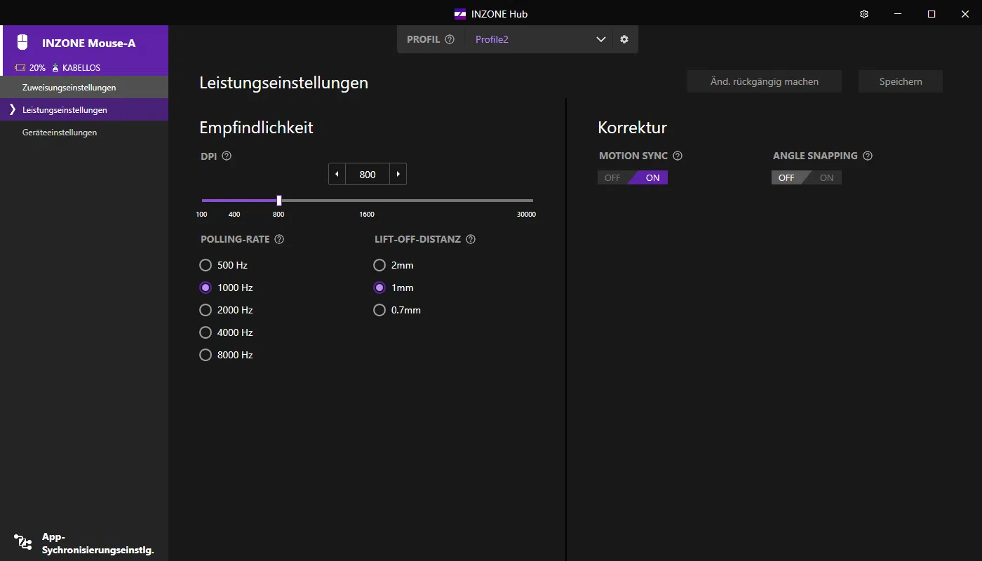 Unter den Leistungseinstellungen könnt ihr die DPI zwischen 100 und 30.000 frei anpassen, die Pollingrate auf 500, 1000, 2000, 4000 oder 8000 Hz festlegen und die Lift-Off-Distanz auf 0,7, 1 oder 2 mm anpassen. Im kabelgebundenen Modus ist nur eine Pollingrate von 1000 Hz möglich. Außerdem lassen sich Motion Sync (Verbesserung der Mausstabilität) und Angle Snapping (Verwackeln der Maus wird korrigiert und die Mausbewegung wird linear) aktivieren.