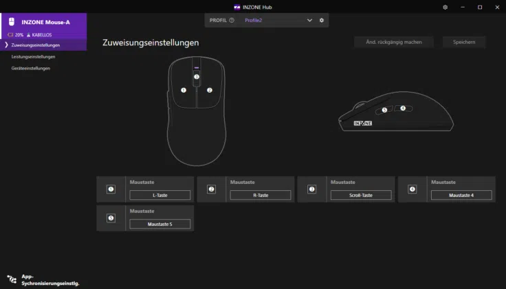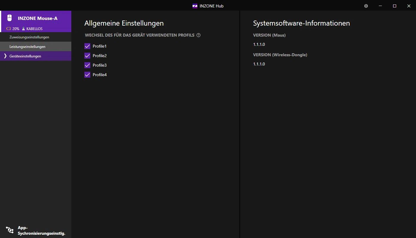 Sämtliche Einstellungen passt ihr über die Inzone Hub Software an, welche es nur für Windows 10 und 11 gibt. In dieser könnt ihr Einstellungen in vier Profilen festlegen. Momentan gibt es drei Menüs mit Zuweisungseinstellungen, Leistungseinstellungen und Geräteeinstellungen.