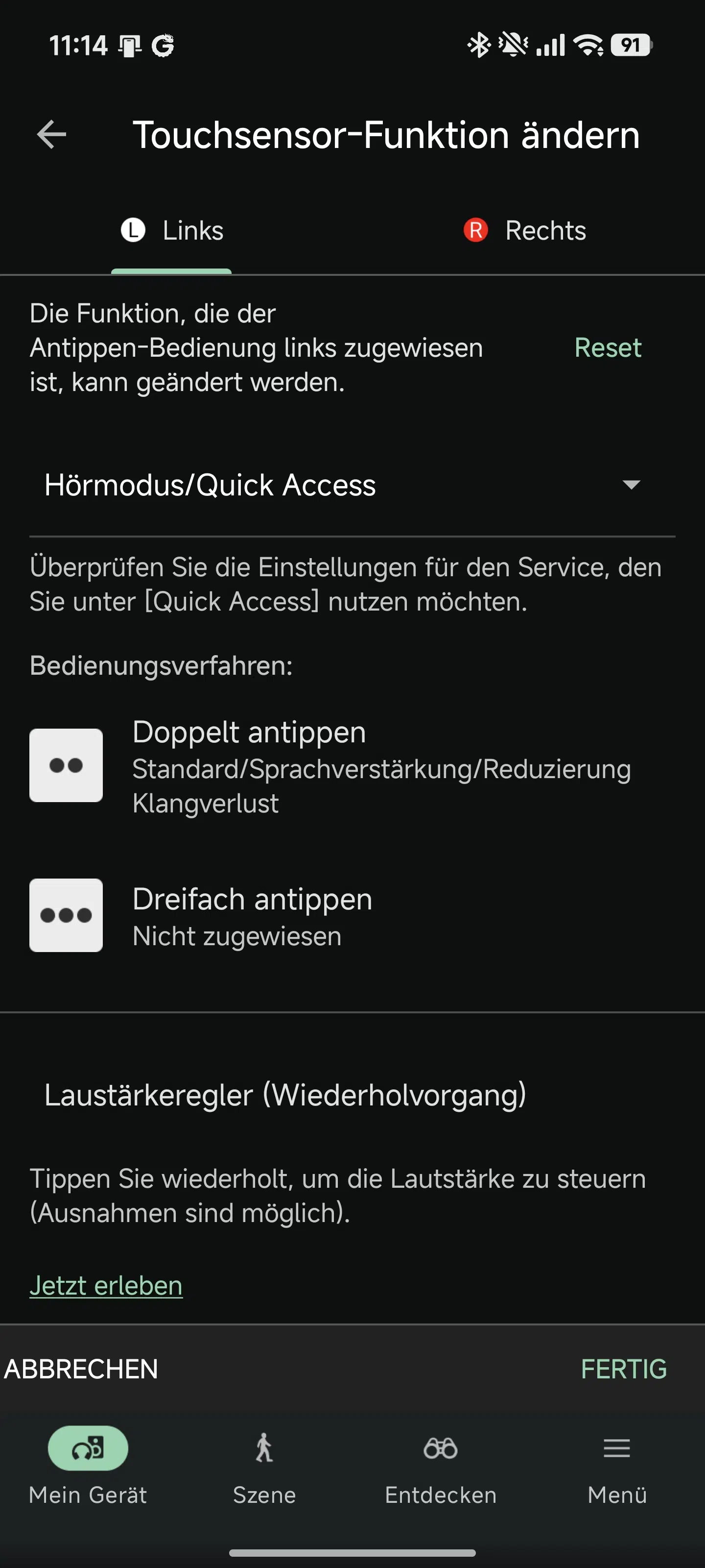 Zur Steuerung der Kopfhörer tippt man wahlweise auf den Steg oder unterhalb des Ohrs. Das direkte Tippen auf die Kopfhörer ist dabei im Test zuverlässiger. Man kann in der App zwischen verschiedenen Steuerungsoptionen wechseln, sodass man z. B. Gemini direkt über die Kopfhörer aktivieren kann. Es handelt sich aber immer um festgelegte Profile, man kann also nicht selbstständig anpassen, wie oft man tippen muss oder z. B. Song pausieren und die Hör-Modi gleichzeitig festlegen.
