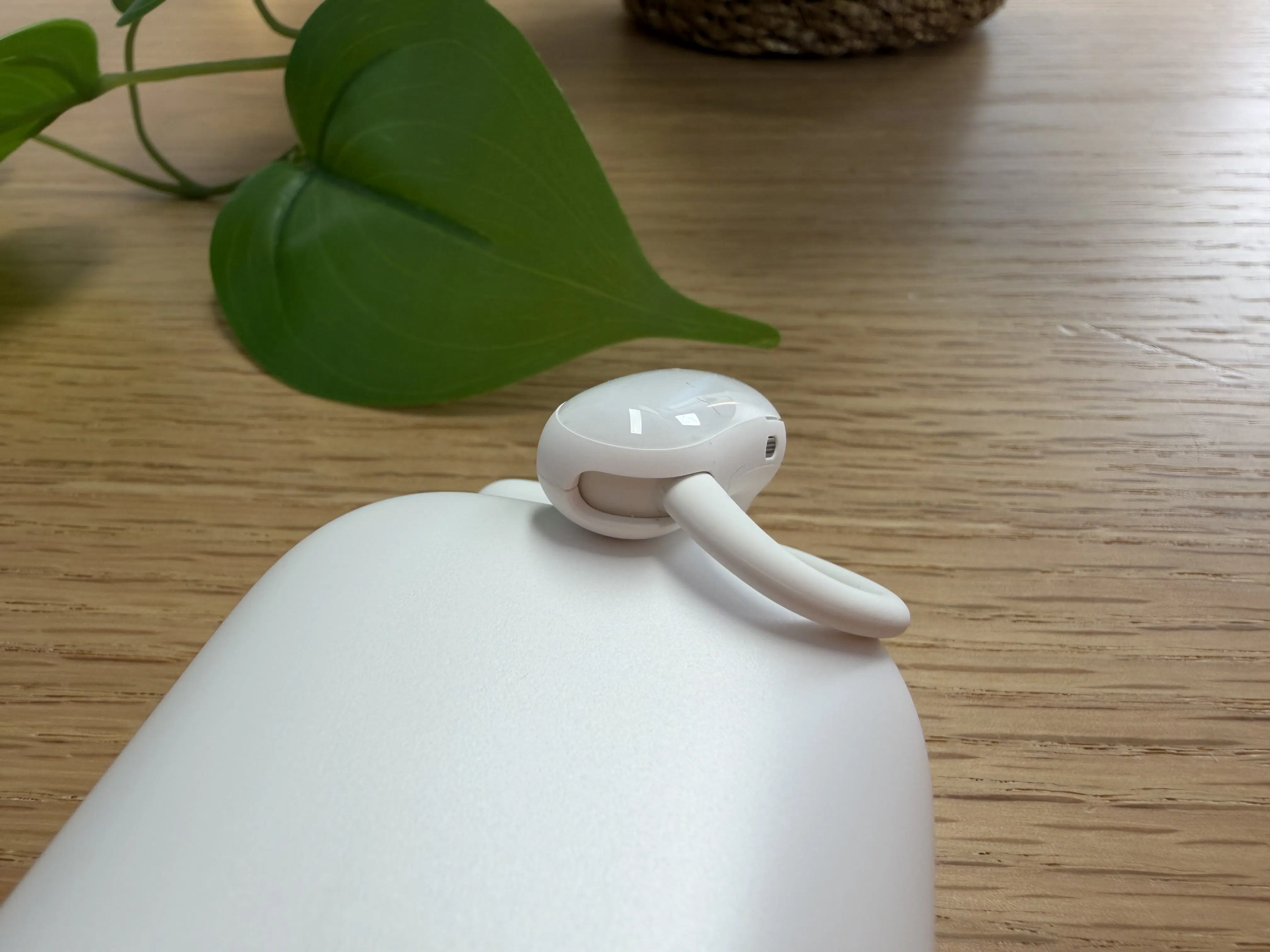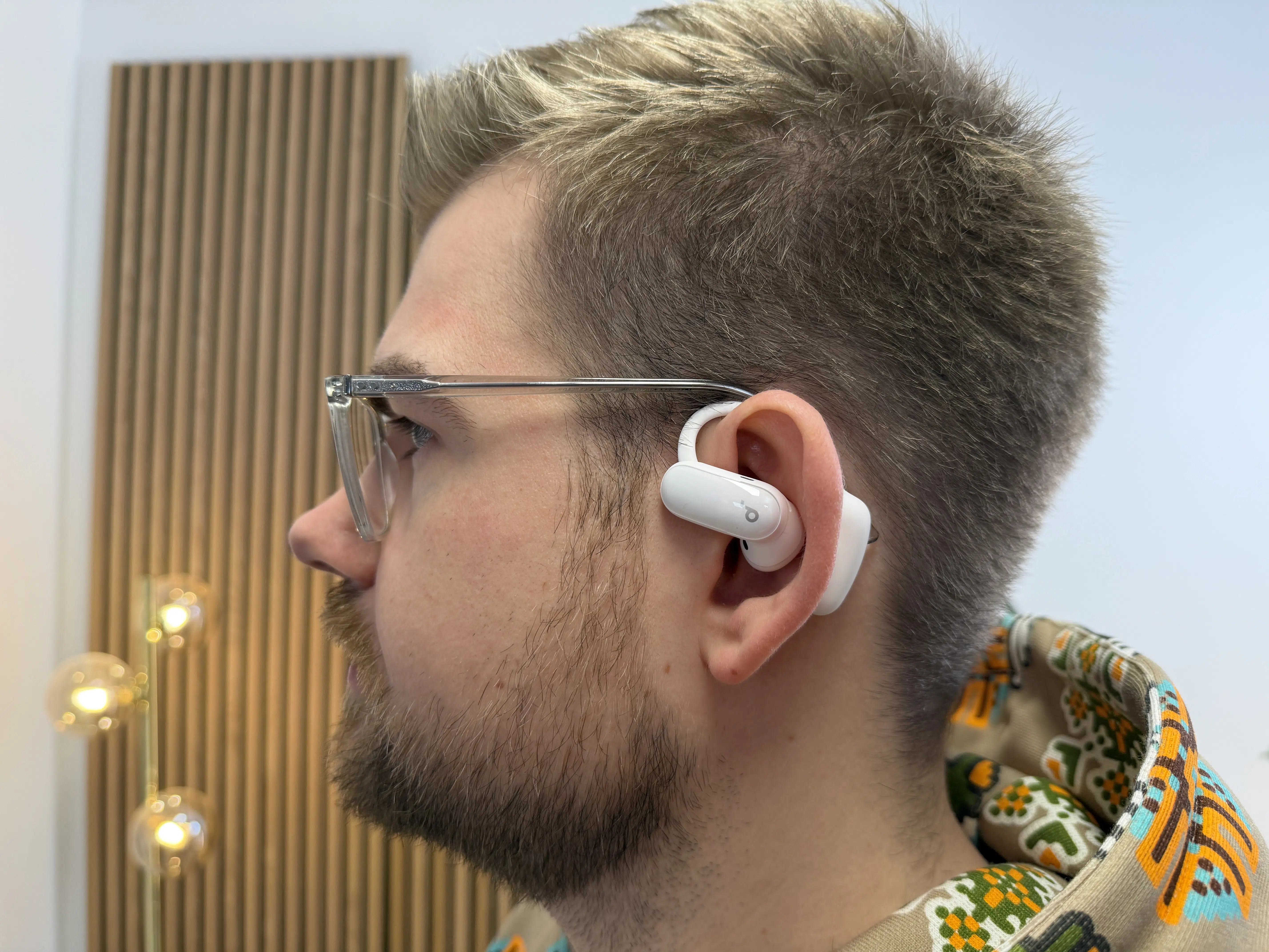 Die Hörer selbst sind nach IP55 gegen Staub und Wasser geschützt. Der Hörerkorpus besitzt eine Form, die an klassische Halb-In-Ears erinnert, wie man sie beispielsweise von den ersten AirPods kennt. Die eigentliche Besonderheit steckt jedoch an der Stelle, an der das vordere Modul mit dem Ohrbügel verbunden ist. Dieser Mechanismus lässt sich in fünf Stufen in einem Neigungswinkel von insgesamt 56 Grad verstellen.