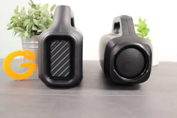 Der neue Soundcore Boom 2 übernimmt im Grunde das markante Design mit großem Tragegriff des Vorgängers, ist allerdings weniger rundlich und erinnert mit schärferen Kanten auch eher an die Tribit Stormbox Blast. Der Tragegriff mag dem ein oder anderen vielleicht optisch nicht so sehr zusagen, er macht seine rund 2 kg Gewicht aber deutlich besser handelbar und er fühlt sich dadurch leichter an als beispielsweise die JBL Xtreme 3, obwohl das Gewicht ähnlich ist.
