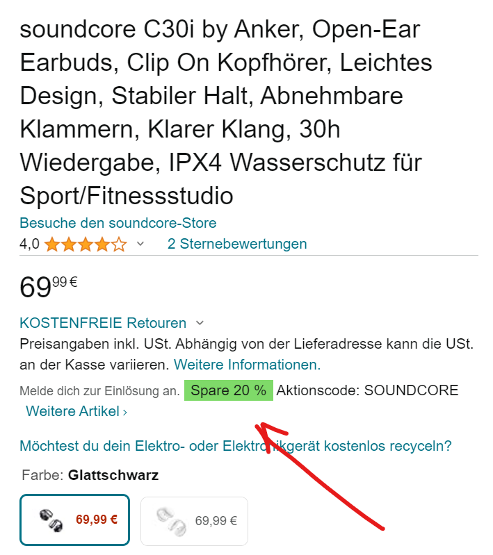 Die Soundcore C30i gibt es bei Amazon gerade für 46,37€ mit dem 20% Gutschein auf der Produktseite.