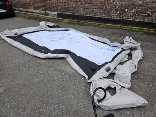 Schon beim Auspacken erinnert die Leinwand an eine „Hüpfburg“, denn einerseits haben wir hier ein sehr ähnliches, wenn nicht sogar das gleiche Material und natürlich auch das gleiche Konzept. Durch das Einfüllen von Luft stellt sich die Konstruktion auf. Die Leinwand selbst ist mit Klett daran befestigt und kann so zum Waschen oder Bügeln auch einfach abgenommen werden.