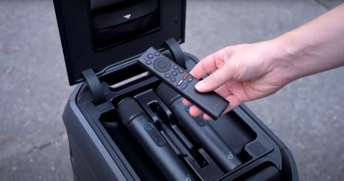 Soundcore spendiert außerdem noch zwei Mikrofone, die standardmäßig beim Beamer dabei sind und mit der Fernbedienung in einem Fach auf der Oberseite verstaut werden. Auf die hätte man sicher verzichten können, da längst nicht jeder Karaoke-Fan ist, aber sie sind nun mal hier.