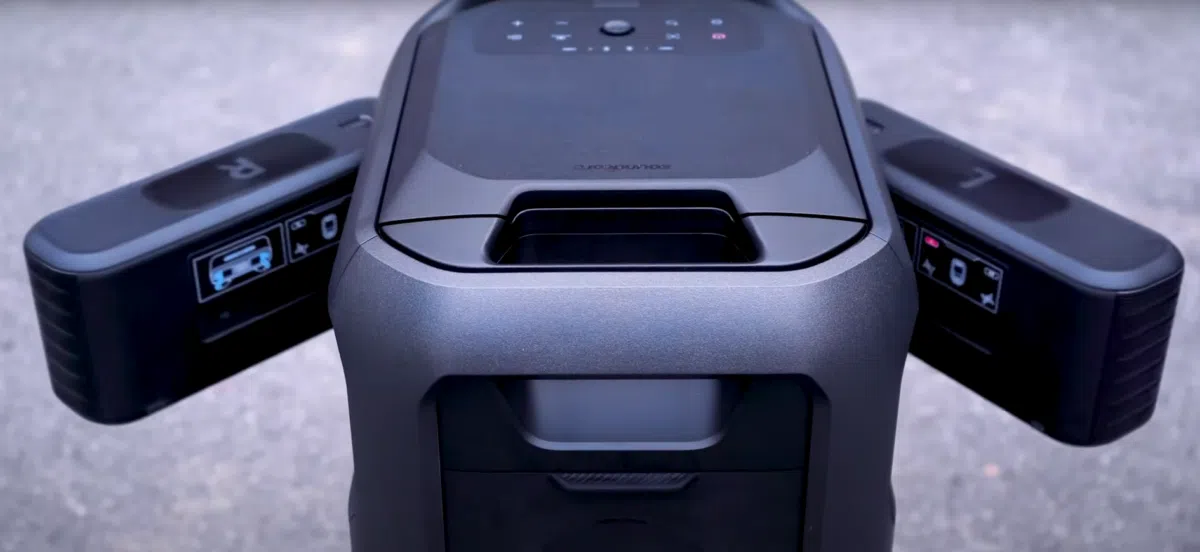 Strom ist natürlich erforderlich, denn ein Akku ist hier nicht verbaut. Schließt den Beamer an und auf Knopfdruck fahren die beiden seitlichen Speaker aus. Diese werden zu beiden Seiten der Leinwand aufgestellt und verbinden sich automatisch mit dem Beamer. Zwei weitere Speaker sitzen hinten im Gehäuse des X1 Pro. Hier muss man noch selbst den Sperrmechanismus lösen, kann die Lautsprecher dann aber ebenso leicht entnehmen und aufstellen – idealerweise auf beiden Seiten hinter dem Zuschauer.
