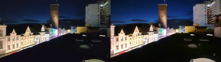 Der Super-Nacht-Modus schraubt die Belichtungszeit nach oben, kann dabei aber leider nicht auf eine optische Bildstabilisierung zurückgreifen. Man muss das Handy also möglichst still halten, um nicht mit verschwommenen Fotos zu enden. Hat man das geschafft, bekommt man deutlich aufgehellte und klarere Fotos. Leider übertreibt TCL das Aufhellen stellenweise, sodass die Häuserdächer im rechten Bild schon fast blau sind. Auf dieser Basis kann man bei zukünftigen Modellen aber durchaus aufbauen.