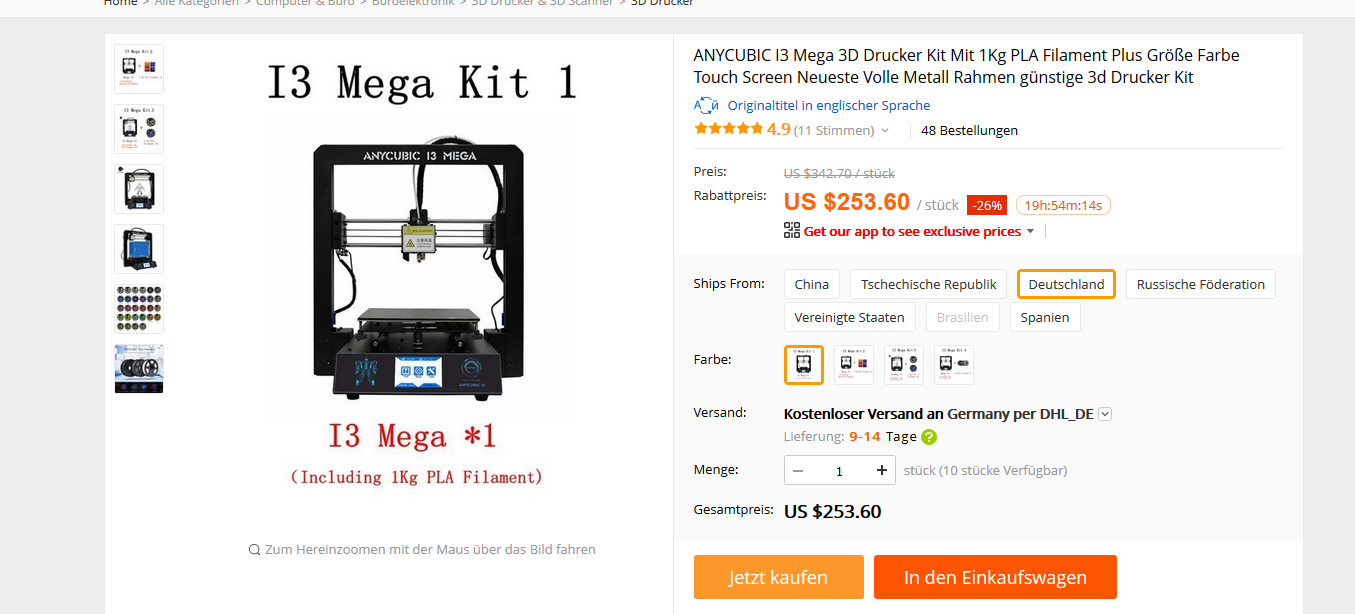 - bei Anycubic für 142€ (Gutschein: NEUEMARKEN | EU-Lager) | Amazon für 177,99€ (42€ Rabattgutschein aktivieren) | AliExpress für 298,75€ (EU-Lager)