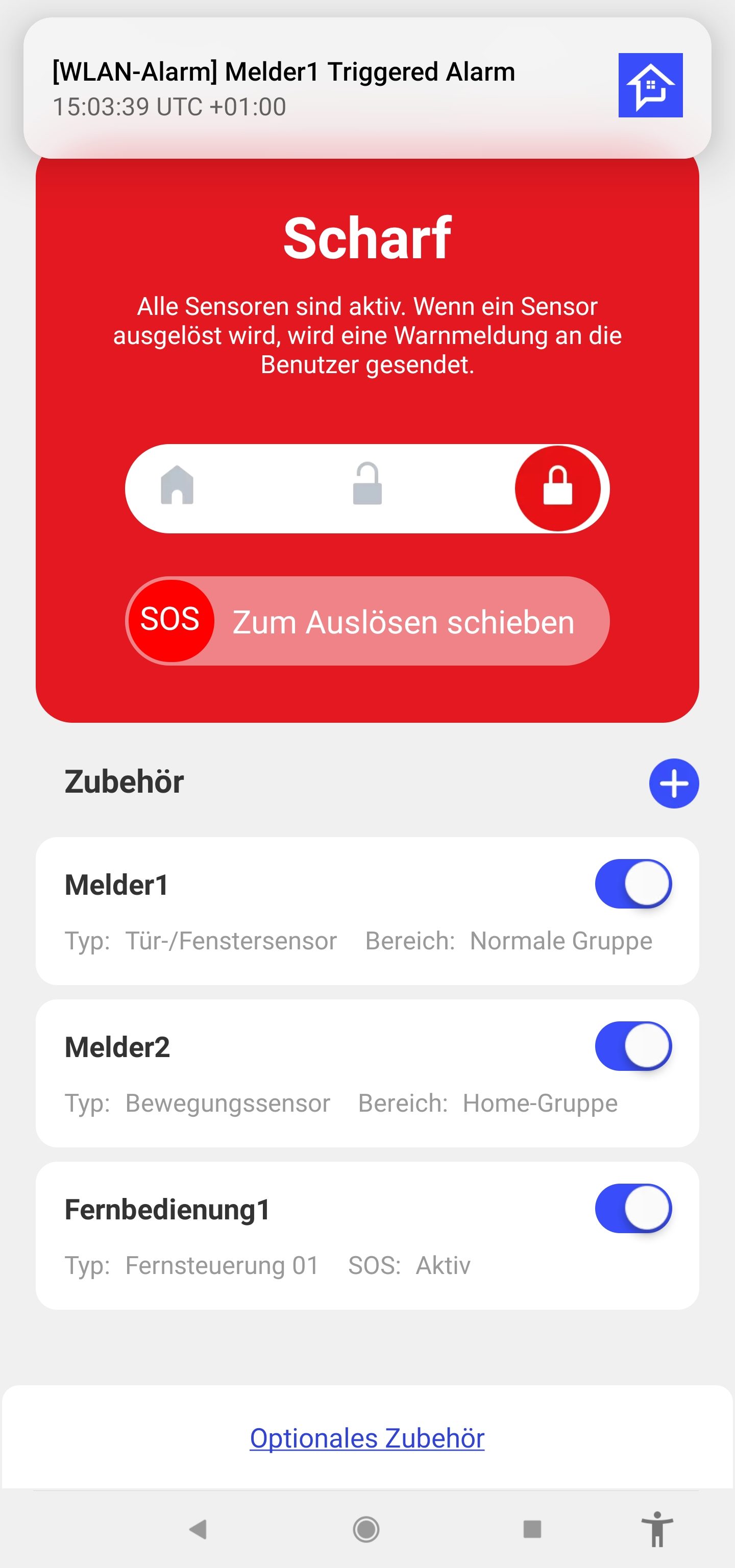 Im scharfen Zustand des Alarm-Systems sind alle Sensoren aktiviert, auch die, die im Haus aufgestellt wurden. Der letzte Alarmmodus der Runde ist der SOS-Modus. Durch diesen ertönt ebenfalls ein Alarm und man kriegt eine Benachrichtigung über die App. Wobei ich sagen muss, dass ich jedes Mal eine Pushbenachrichtigung bekommen hab, wenn der Alarm ausgelöst wurde. Den Modus sehe ich also eher als Vorsichtsmaßnahme, um unerwünschte Gäste zu verscheuchen.