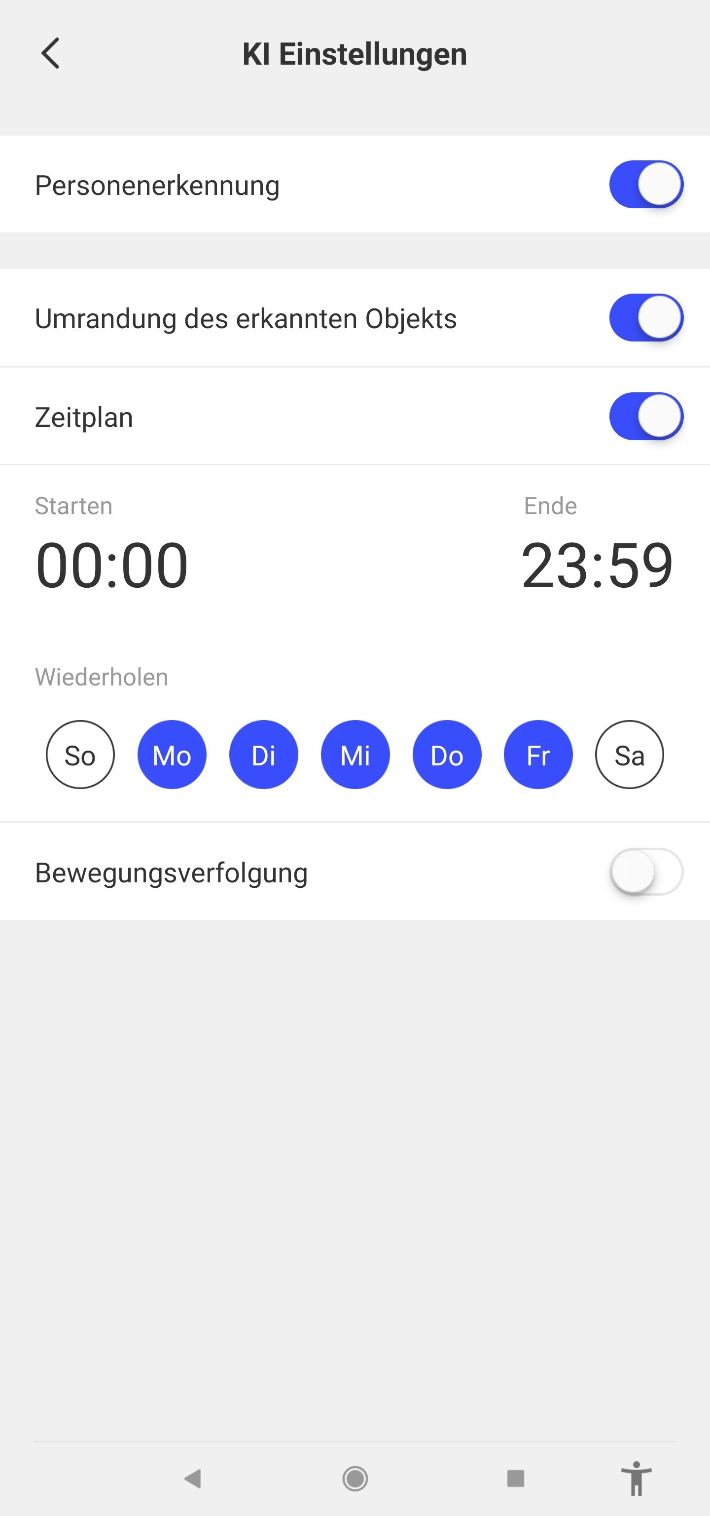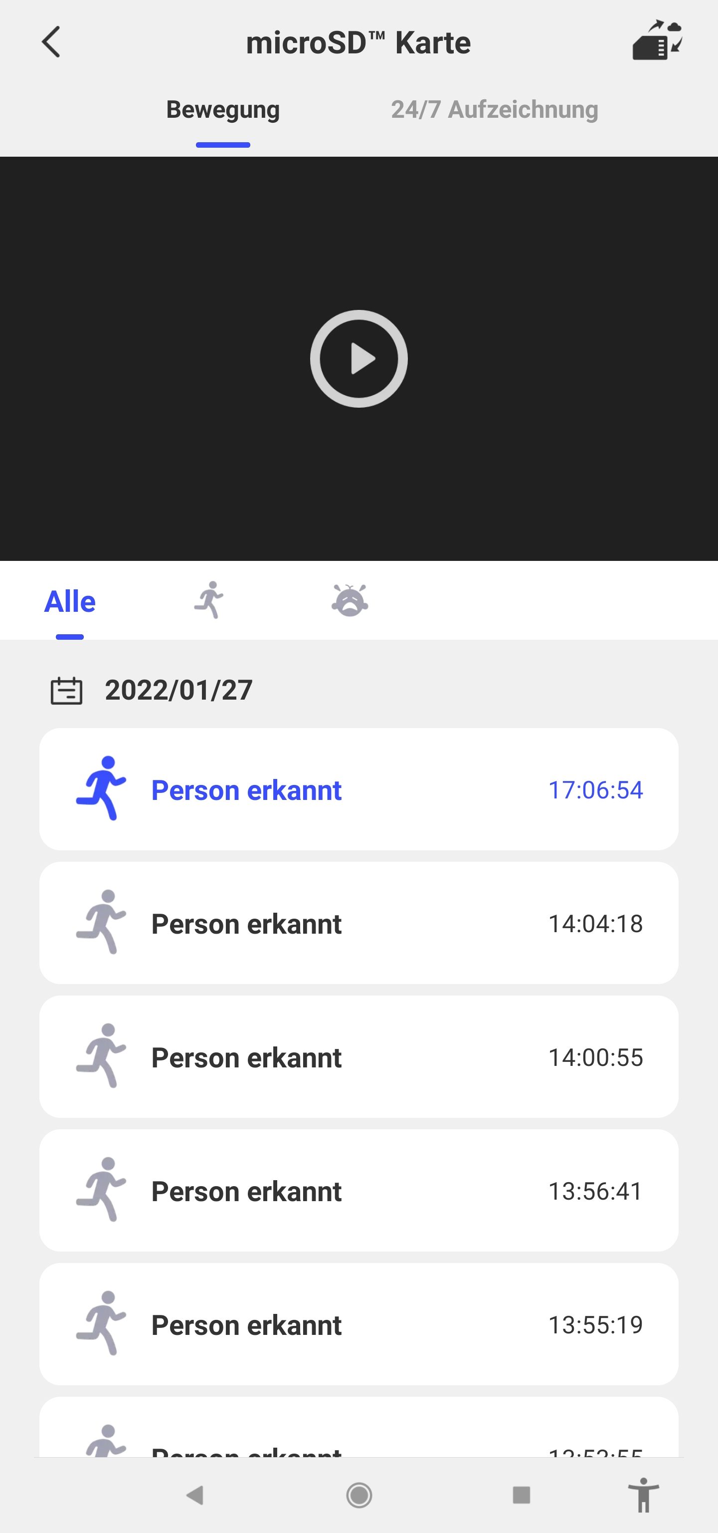 Die 24/7 Aufzeichnung kann wie der Name schon sagt 24 Stunden jeden Tag aufzeichnen. Man kann dort die Bewegungserkennung an verschiedenen Tagen abspeichern und kriegt eine genaue Benachrichtigung, wenn eine Person erkannt wurde. Man hat beim Abspeichern der Videos die Auswahl zwischen Handy, microSD-Karte oder einer kostenpflichtigen Cloud als Speicherort für die Dateien. Was mir gut gefällt, man bekommt anders als bei manch anderen Herstellern keine nervigen Anzeigen oder ist auf die Cloud angewiesen.
