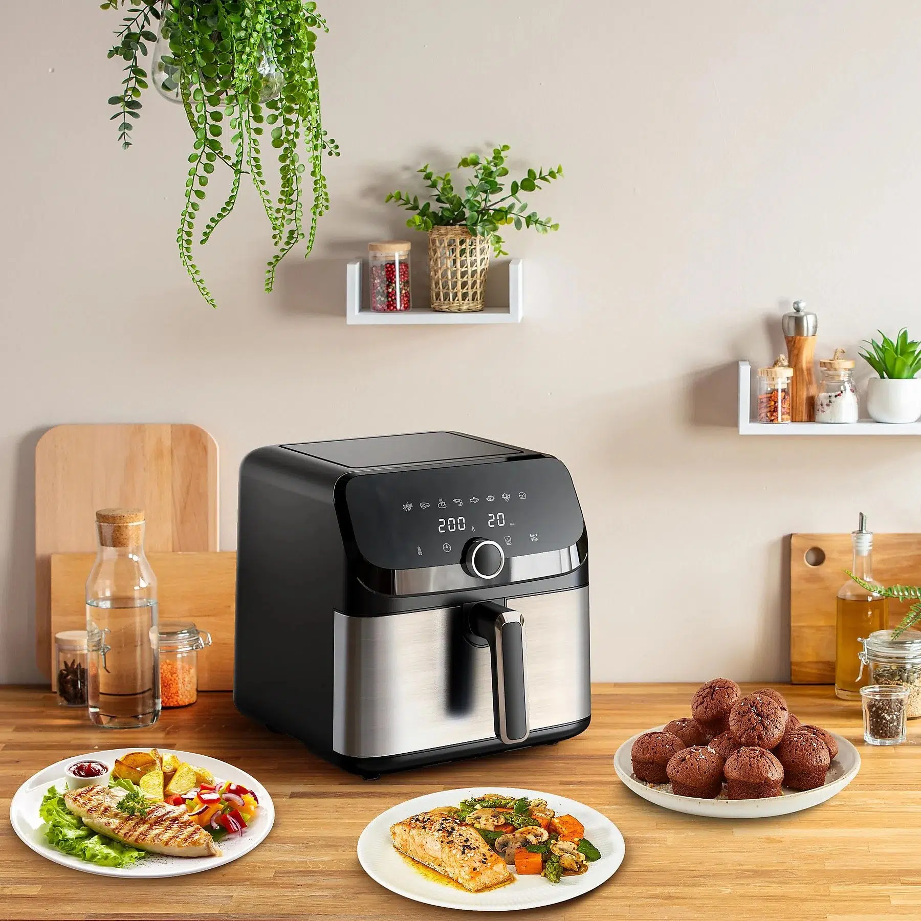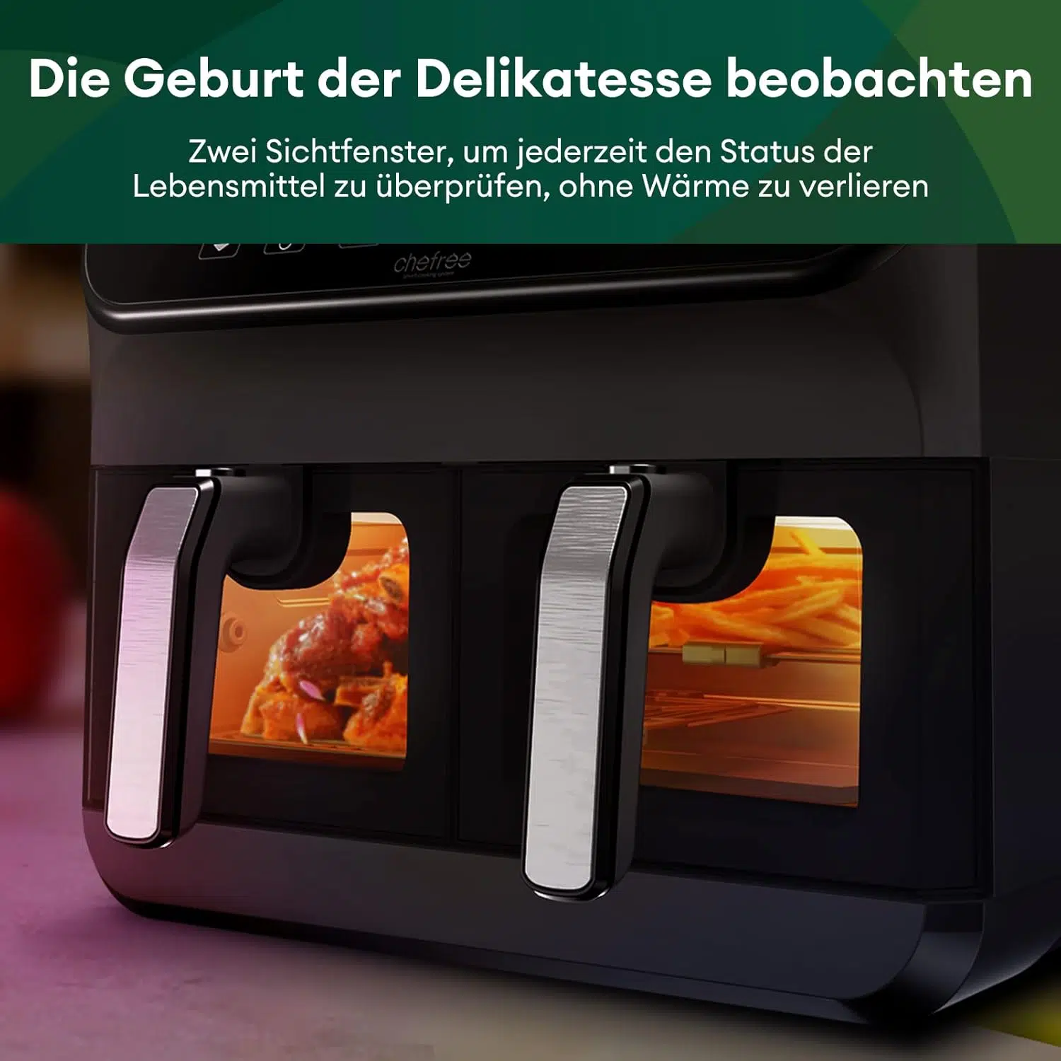 Mit der CHEFREE Dual Zone Heißluftfritteuse 8L könnt ihr zwei verschiedene Gerichte gleichzeitig zubereiten, dank separater 4-Liter-Garkörbe und individuellen Temperatureinstellungen. Das kommt uns bereits von den Ninja Air Fryer bekannt vor, ein Sichtfenster für den Überblick wäre hier zumindest neu und ein potentielles Highlight.