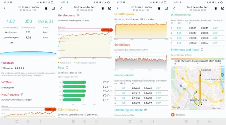 Das Lauftracking habe ich mit einer Garmin Venu 2S verglichen. Obwohl die TicWatch E3 laut Mobvoi die Satellitensysteme GPS, Beidou und GLONASS unterstützt, benötigt die Uhr immer gute 30 Sekunden für den GPS-Fix. Die Garmin schafft das schon nach 10 Sekunden und auch die Huawei Uhren schaffen die Positionierung in dieser Zeit. War die Positionierung dann aber erfolgreich, ist Verbindung stabil und das Tracking genau. Ich hatte eine durchschnittliche Abweichung von 3-5% zur Garmin, was für eine Uhr, die mehr Smartwatch als Fitnesswatch ist, absolut in Ordnung geht.
