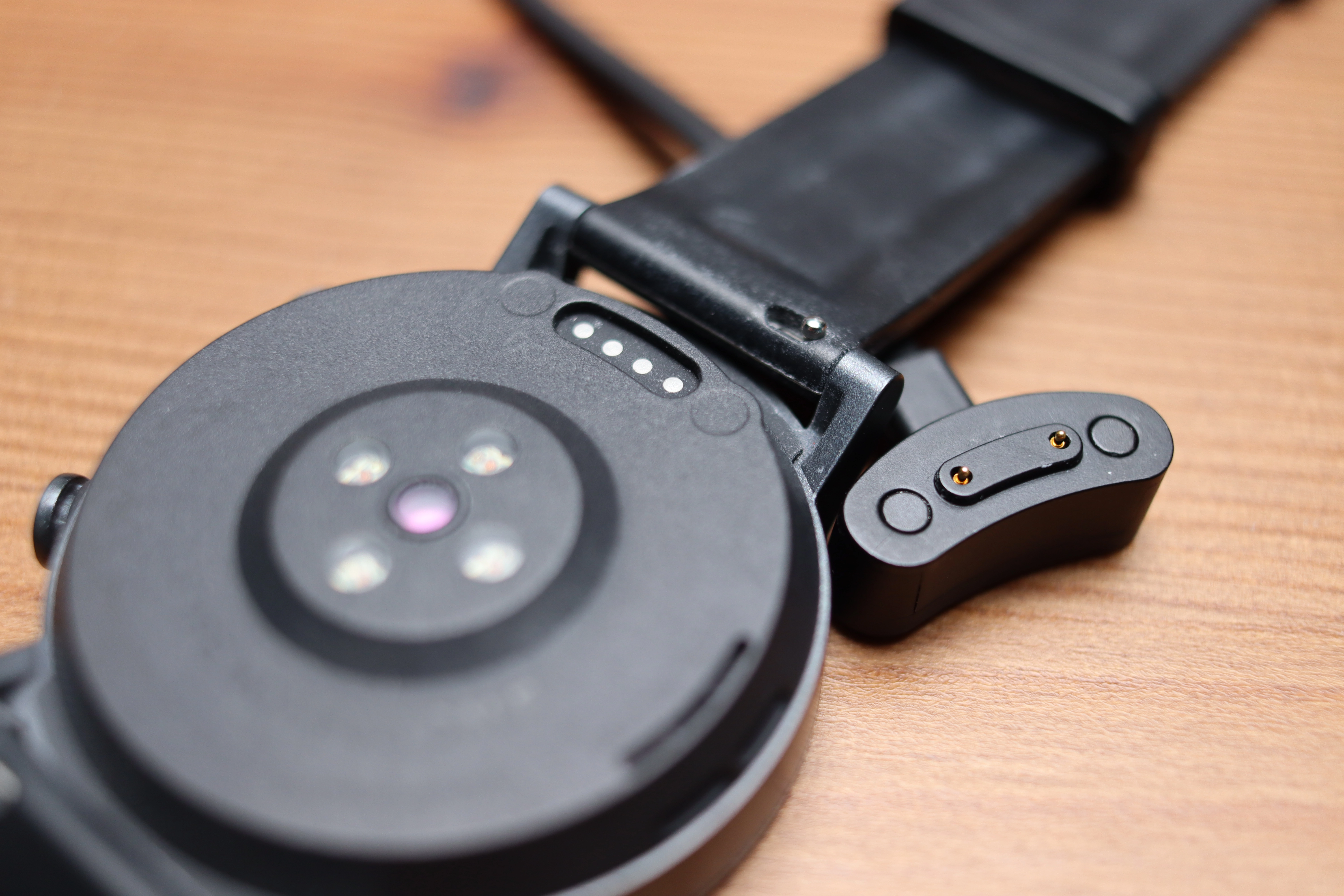 Dementsprechend ist die Uhr auch sehr leicht und bringt mit Band lediglich 48 Gramm auf die Waage. Dieses „leichte“ Design setzt sich bei den Maßen leider nicht fort. Mit einer Höhe und Breite von 47x 44 mm und einer Dicke von 12,6 mm ist die E3 definitiv keine kleine Uhr und sogar nochmal dicker als die bereits auf der großen Seite angesiedelte TicWatch Pro 3. Damit die Dicke nicht ganz so auffällt ist die Rückseite schwarz und der Rand etwas nach innen geneigt. Auf der Rückseite sind natürlich die verschiedenen Sensoren sowie die Ladekontakte zu finden.