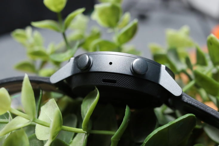 Vorne gibt es ein 1,3 Zoll großes Display, welches von minimal abgerundeten 2,5D-Glas geschützt wird. Leider sieht man hier auch einen großen schwarzen Displayrand, welcher eher an ältere Smartwatches erinnert, als an eine 200€-Uhr mit dem neusten Snapdragon-Chip.