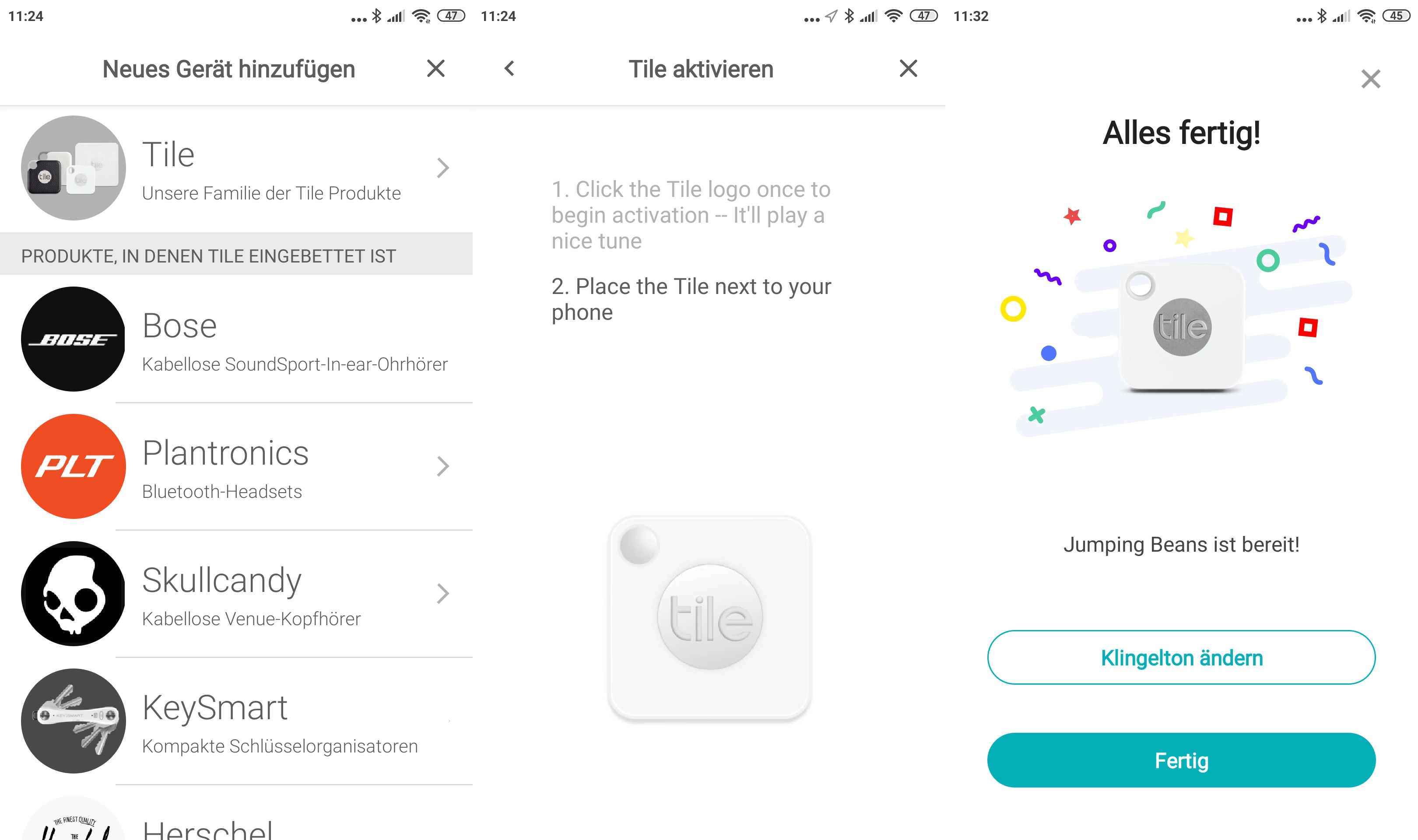 Zunächst braucht ihr die App zum Tracker. Diese trägt ebenfalls den Namen Tile und ist sowohl für Android als auch iOS erhältlich. Hier müsst ihr euch dann einen Account anlegen, was zunächst außer einer E-Mail-Adresse keinen weiteren Informationen bedarf. Aus einer Liste könnt ihr dann das gewünschte Teil auswählen. Hier sieht man, das bereits verschiedene Hersteller – zum Beispiel Bose – mit Tile zusammenarbeiten und entsprechende Tracker in ihren Produkten verbauen. Besitzt ihr ein entsprechendes Produkt, beispielsweise die kabellosen Sport-Kopfhörer von Bose, dann könnt ihr das sogar ohne Tracker direkt mit der App verbinden.
