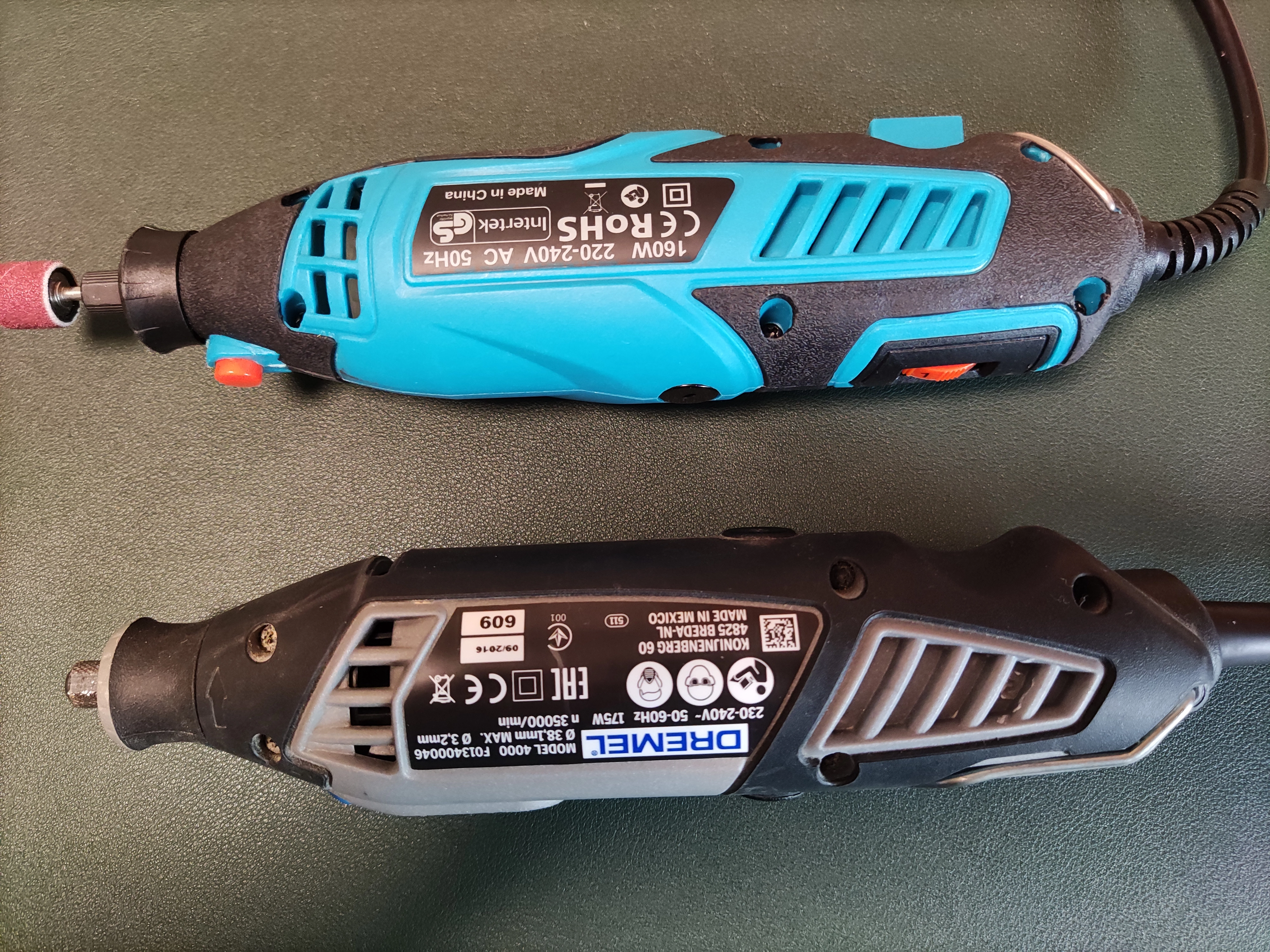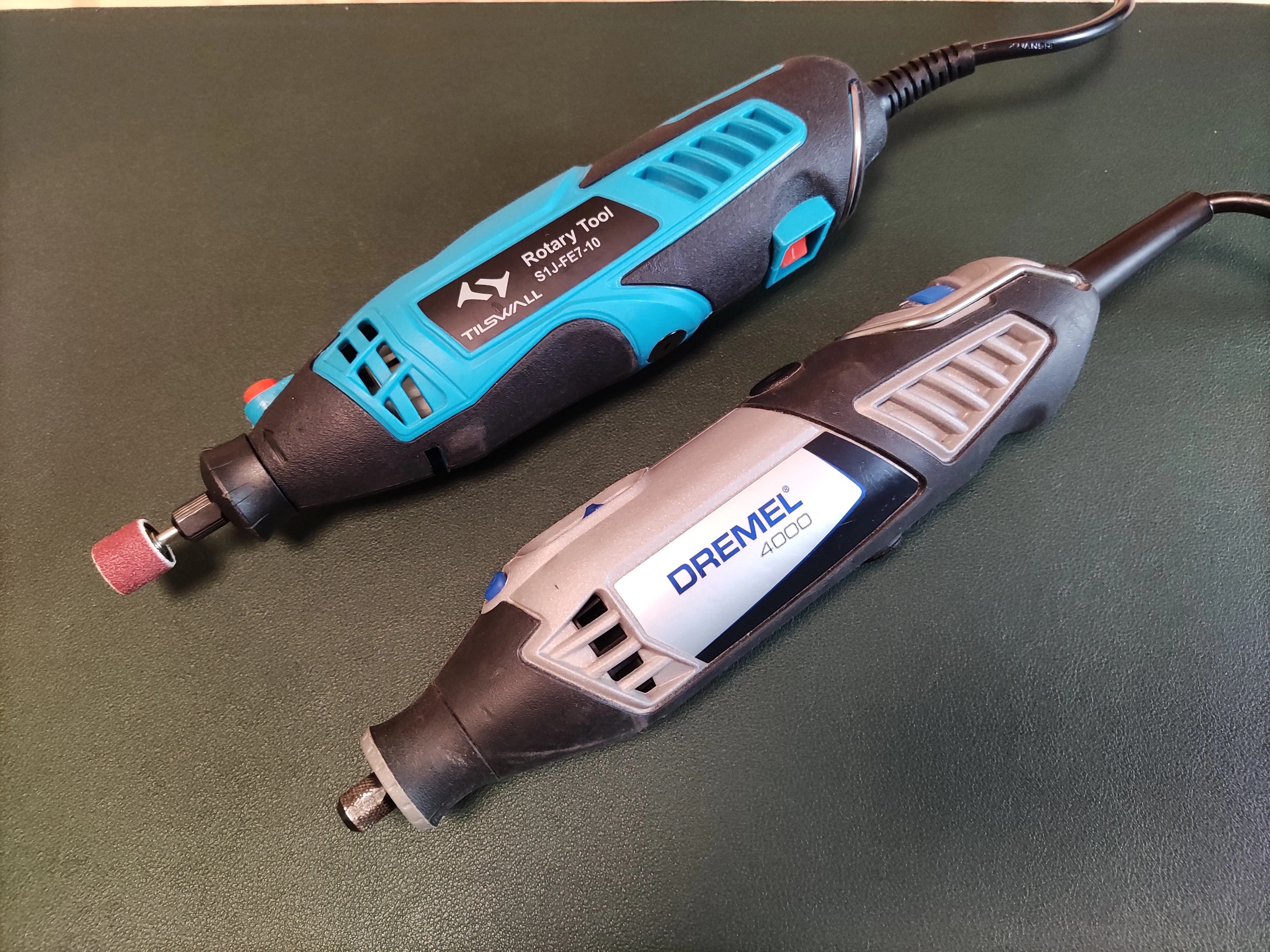 Zuerst der Hinweis, dass Dremel in verschiedenen Modellreihen und Sets mit unterschiedlichem Umfang an Zubehör gekauft werden können. Ich vergleiche das Tilswall Multifunktionswerkzeug mit der Standardausführung des Dremel 4000, die ich jedoch nicht hier habe, nur den Dremel an sich (ausgeliehen). Meiner Meinung nach ist das Zubehör hier am vergleichbarsten. Ich konzentriere mich aber auf das Gerät an sich, die verschiedenen Bits sind kompatibel für beide Modelle.