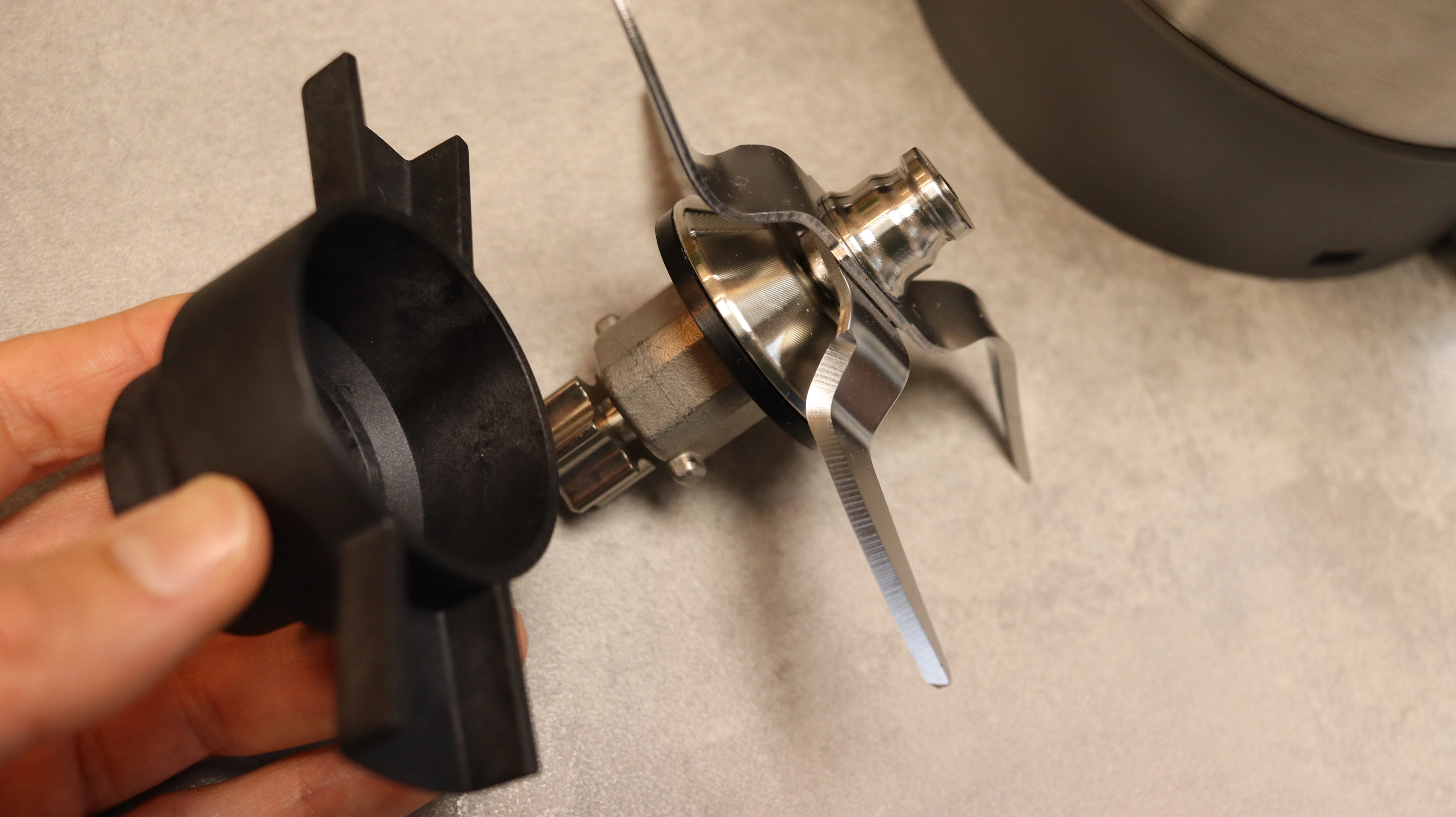Möchte man das Messer entfernen, muss man unten eine Art „Mutter“ lösen, die das Messer festhält und nicht den ganzen Boden des Mixtopfs wie bei dem Original. Das hat einen kleinen Nachteil bei der Reinigung, den wir später thematisieren. Der Kunststoffboden kann bei Bedarf aber mit drei Schrauben gelöst werden. Auch der Mixtopf wird anders eingesetzt. Beim Reinstellen rastet der automatisch ein, möchte man ihn entfernen, muss man links einen Schieberegler verschieben.