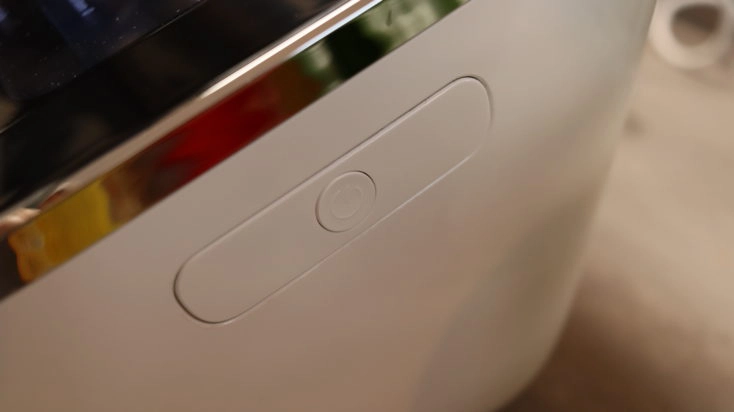 Unter dem 7″ Display befindet sich ein Drehknopf, der genau wie bei dem Original ebenfalls essenziell für die Bedienung der Küchenmaschine ist. Während ihr mit dem Touchscreen durch das Menü navigiert und Rezepte auswählt, stellt ihr mit dem Drehrad zum Beispiel die Stufe, Temperatur und die Zeit ein. Das ist gerade beim Kochen und Backen sinnvoll, falls die Finger z.B. ölig sind, ist die Bedienung des Drehkopfs einfacher und besser als über den Touchscreen. Mit einem Klick auf den Knopf startet man das Programm oder beendet das. Nur, dass der Drehknopf in manchen Einstellungen invertiert ist, ist teilweise nicht intuitiv. Ein- und Ausschalten erfolgt allerdings über den Power-Button an der Seite.
