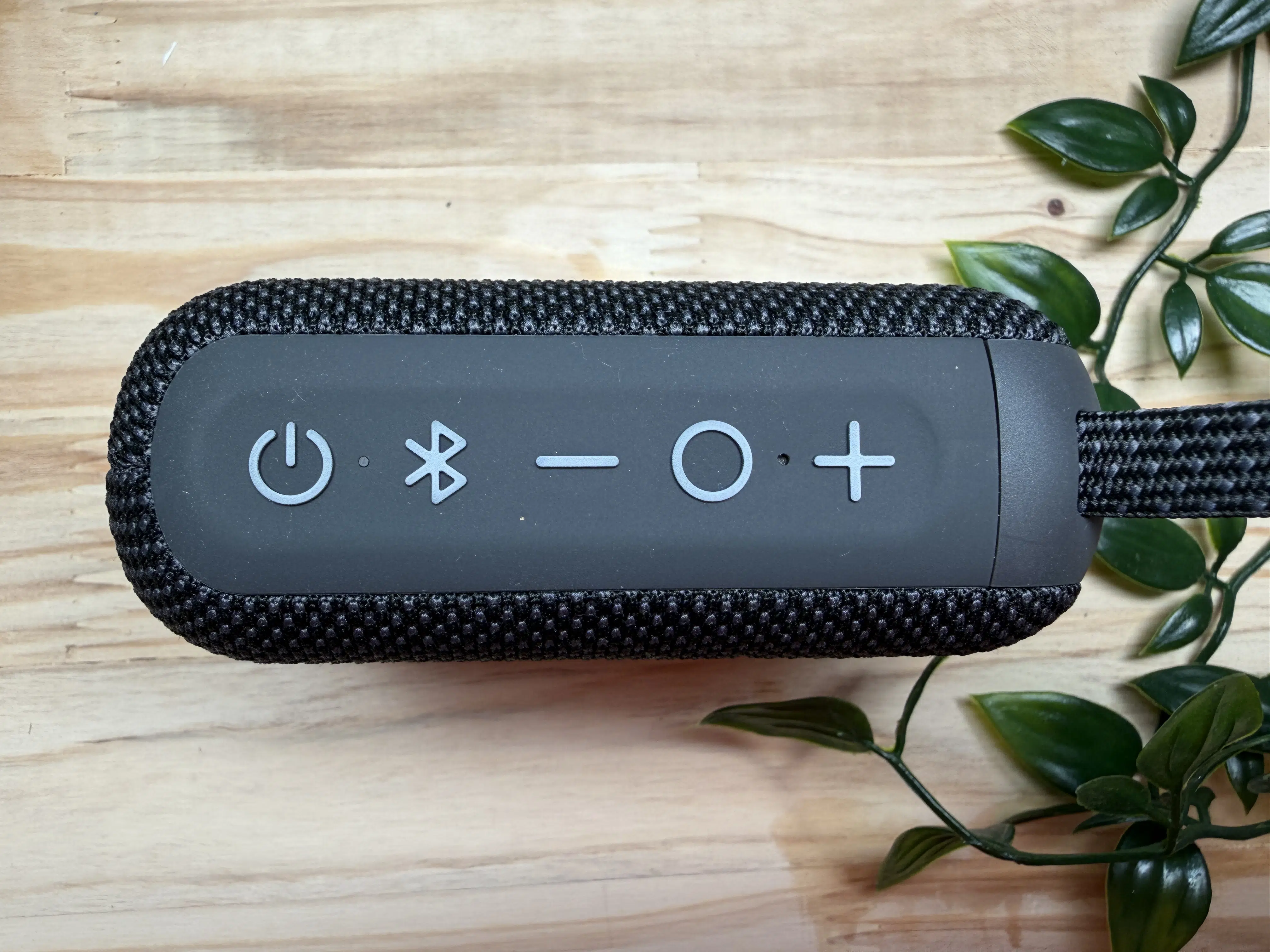 Auf der Oberseite des Tribit PocketGo finden sich fünf physische Tasten: Ein/Aus, Bluetooth-Knopf, Leiser, Lauter und ein Multifunktions-Knopf. Die Funktion der Tasten ist, mit Ausnahme des Multifunktions-Knopfs, selbsterklärend. Dieser steuert die Wiedergabe: