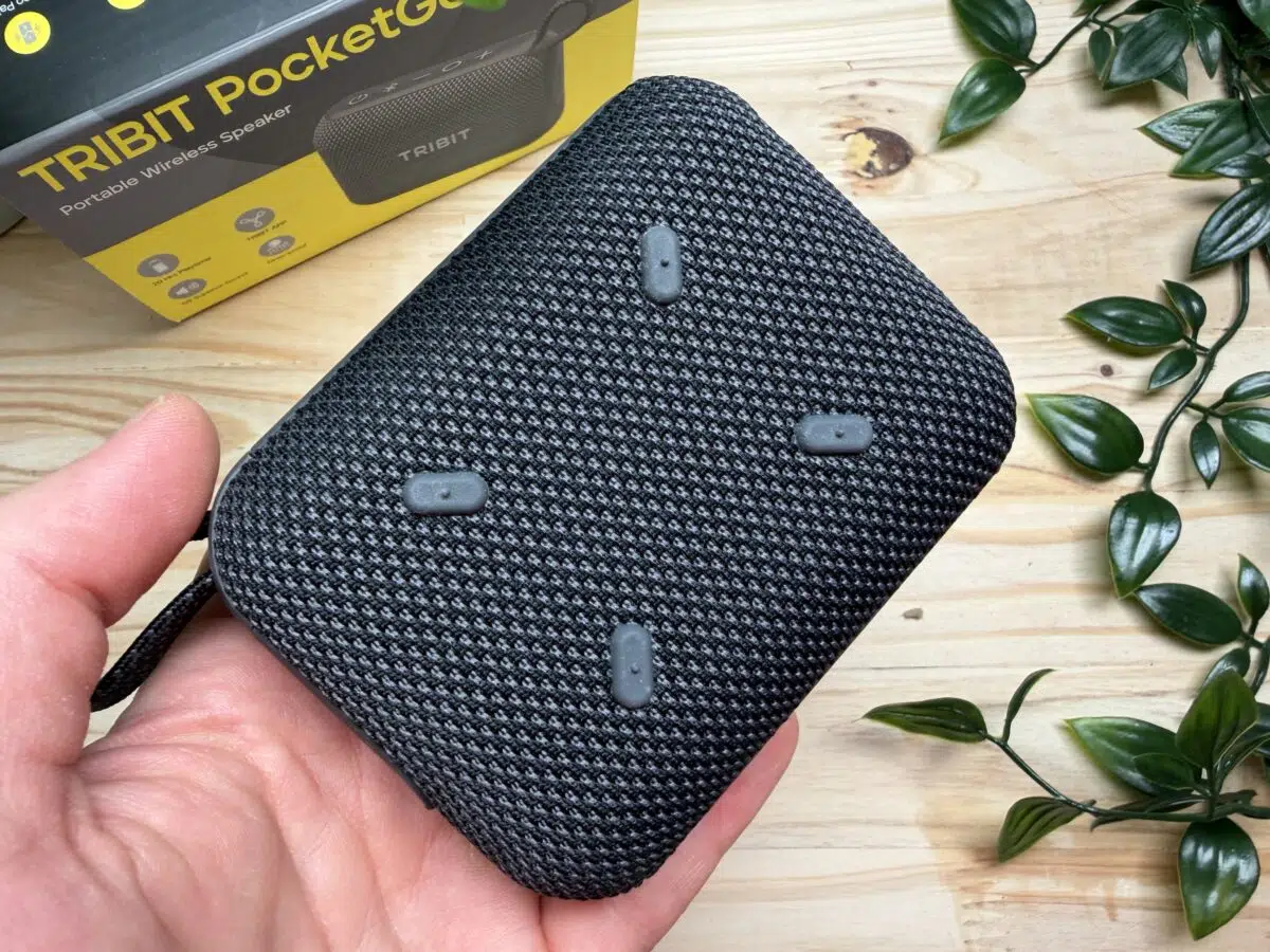 Nicht nur der Name „Tribit PocketGo“ erinnert stark an das bekannte JBL-Pendant, auch beim Design hat sich Tribit ganz offensichtlich inspirieren lassen. Mit Maßen von 108 x 81 x 42 mm ist der PocketGo etwas länglicher, bleibt in Höhe und Tiefe aber vergleichbar zur JBL Go 4. Wie beim „Original“ ist der Lautsprecher fast vollständig von einem robusten Textilmantel umhüllt.