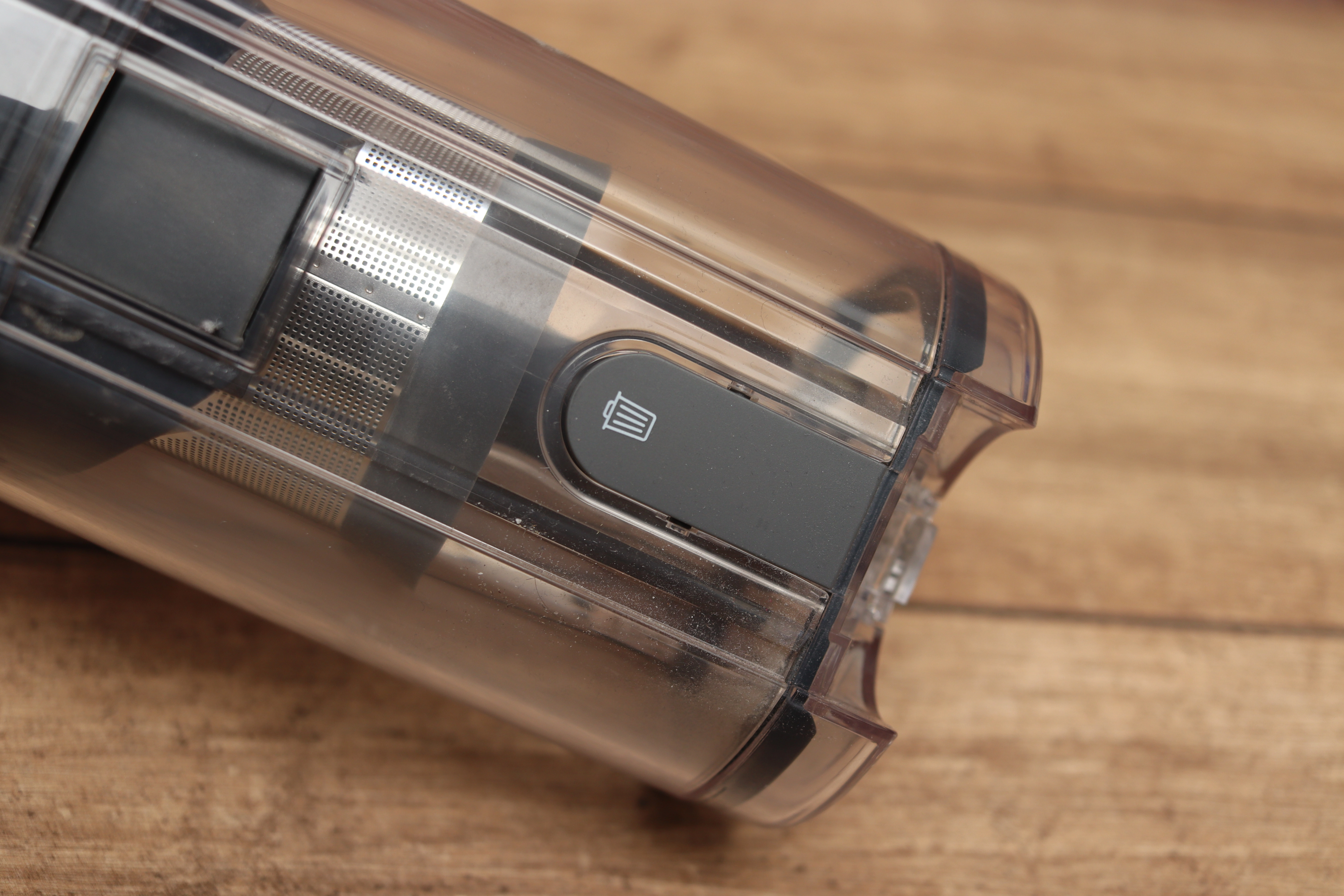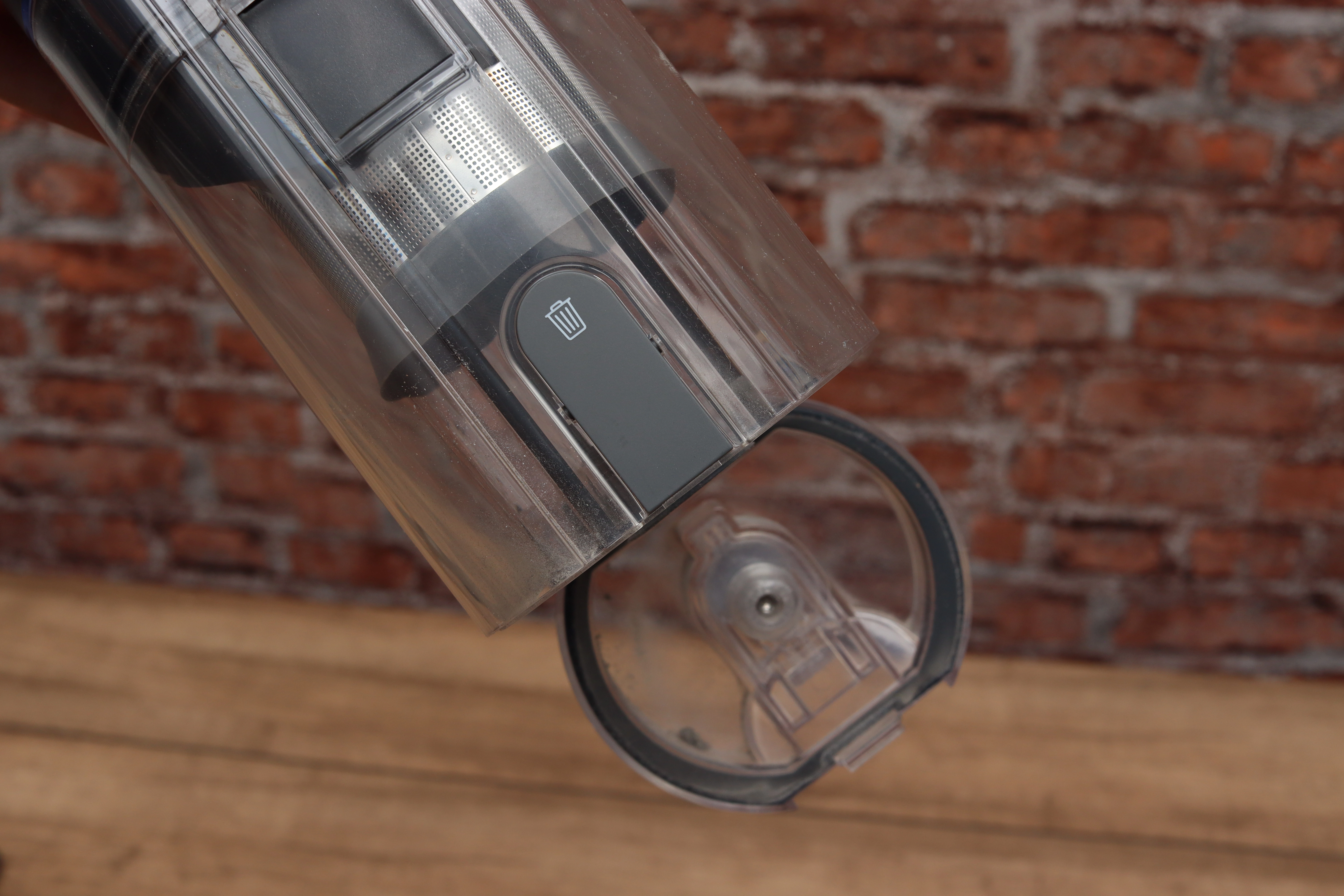 Um die Staubkammer zu entleeren, muss man diese einmal vom Trouver entfernen. Dies funktioniert recht einfach über einen simplen Knopf, wodurch man mit der Staubkammer zum Mülleimer gehen kann und das schwerere Hauptelement abstellen kann. Für manche vielleicht ein Schritt zu viel, weil sie direkt mit dem ganzen Akkusauger zum Ausleeren gehen wollen, aber eigentlich finde ich es persönlich recht praktisch.