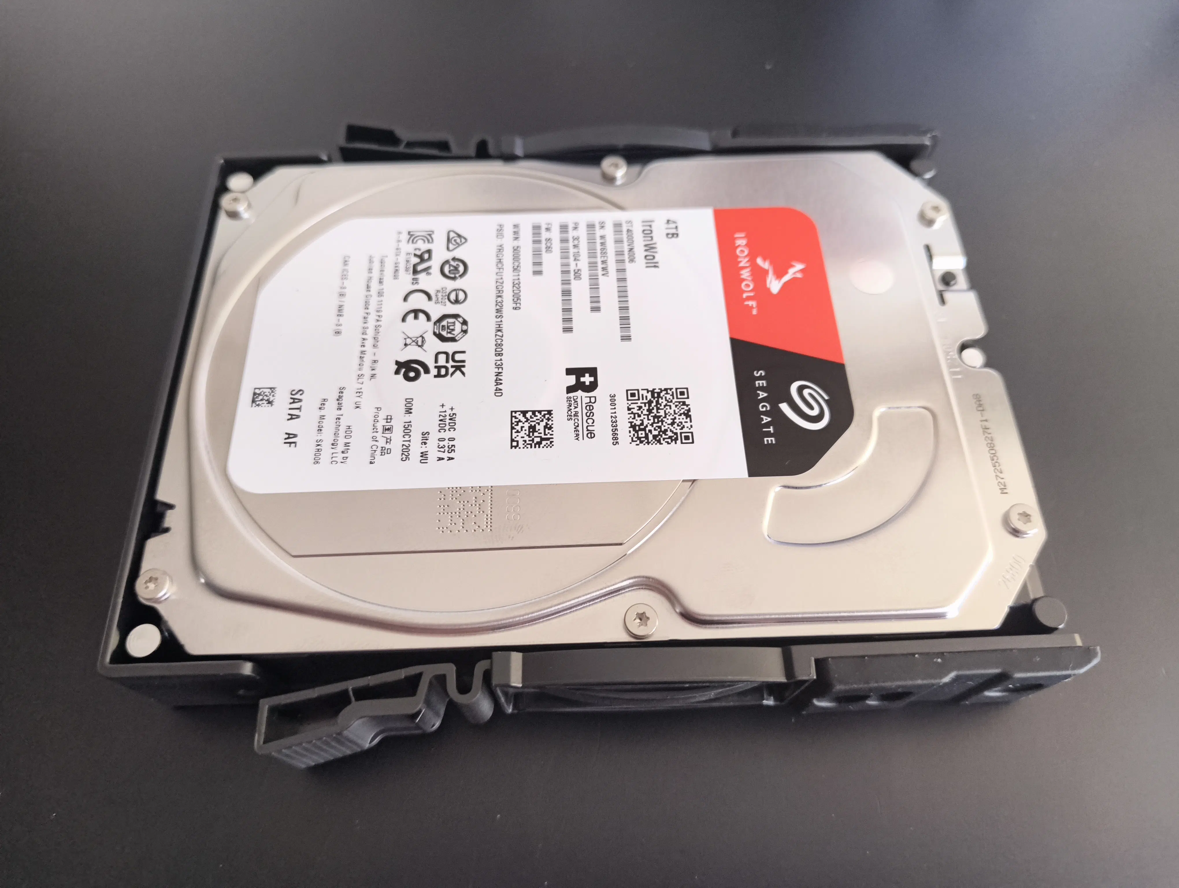 Zwei Festplatten finden im Gerät Platz. Bis zu 60 TB. Das klingt erstmal nach viel, wirklich nutzbar davon wäre aber nur die Hälfte. Wieso das so ist, klären wir später. Da ich aber nicht so viel Speicherplatz brauche, habe ich mich für zwei Festplatten mit je 4 TB (erhältlich zB. bei alza.de) entschieden.