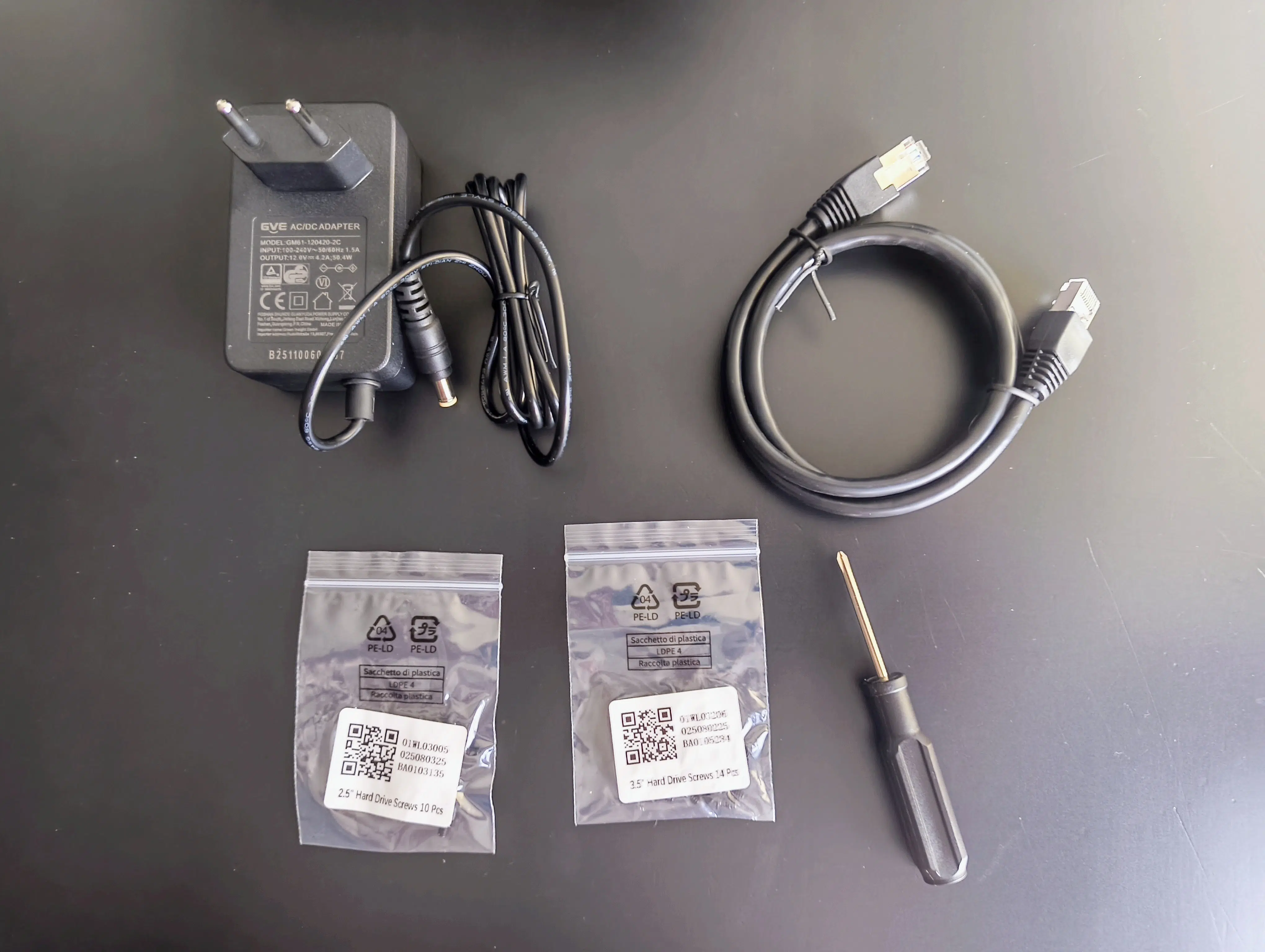 Der Lieferumfang fällt erstaunlich schmal aus. Neben dem Gerät, dass hochwertig verarbeitet wirkt, finden sich noch eine Betriebsanleitung, ein Netzwerkkabel und ein Stromkabel. Auch Schrauben und ein Schraubenzieher sind dabei. Eure Festplatten müsst ihr nämlich ins Gehäuse einschrauben. Aber kein Sorge, das klingt schlimmer als es ist.