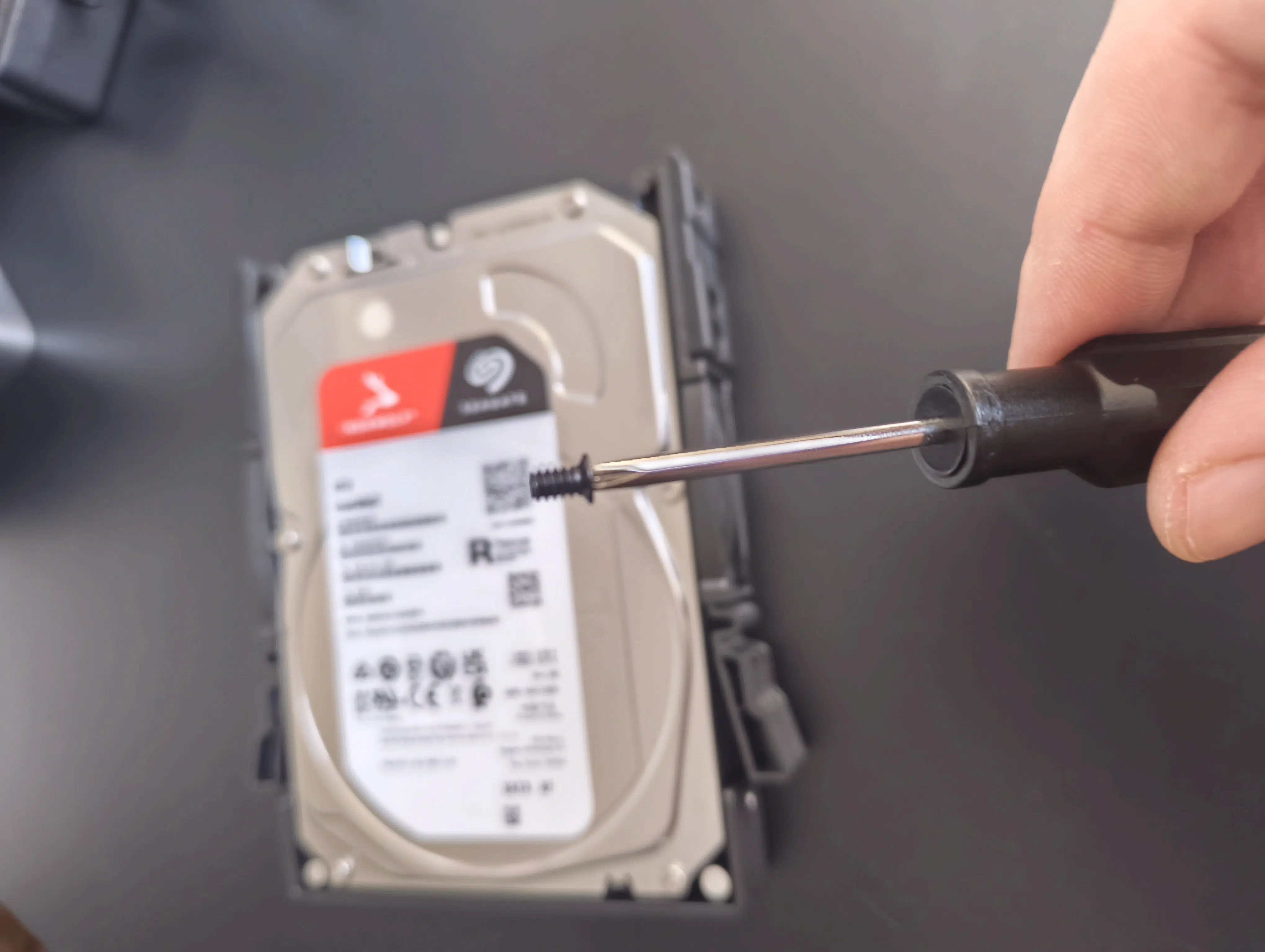 Der mitgelieferte Schraubenzieher hält eure Schrauben magnetisch. Das macht die Befestigung der Festplatten im Gehäuse noch mal einfacher. Jede Festplatte wird mit jeweils sechs Schrauben befestigt. Drei auf jeder Seite. Das ist in ein paar Minuten erledigt. Im Anschluss einfach die beiden Einschübe wieder zurück ins Gehäuse schieben. Ihr hört ein befriedigendes „Klack“: Die Festplatten sind eingerastet, jetzt kann es weitergehen.