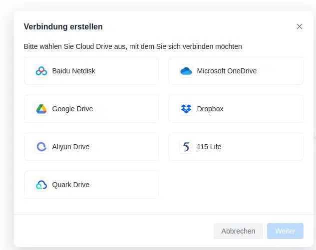 Wenn ihr schon Daten auf einer externen Cloud habt, könnt ihr diese direkt mit eurem NAS verbinden und die Dateien entweder herunterladen oder synchron halten. In meinem Fall habe ich Dateien aus dem Google Drive heruntergeladen. Nicht alle Anbieter werden aktuell unterstützt (siehe Screenshot). Zur iCloud könnt ihr beispielsweise keine direkte Verbindung herstellen.