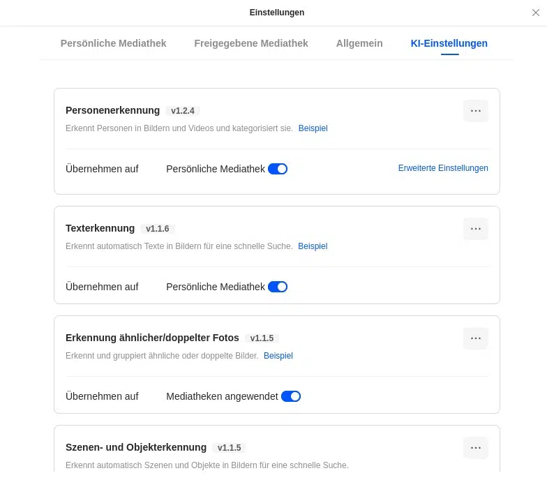 Spannend: Ihr müsst hier nicht auf Komfort verzichten. Falls ihr eine Personen- oder Objekterkennung wünscht, kann das NAS die lokale KI dafür benutzen, eure Fotos zu analysieren. Auch Texterkennung ist möglich. Doppelte oder ähnliche Bilder können ebenfalls angezeigt werden. Die KI ist von Haus aus deaktiviert und muss manuell hinzugefügt werden. Das geht mit 1-2 Klicks aber ganz einfach.