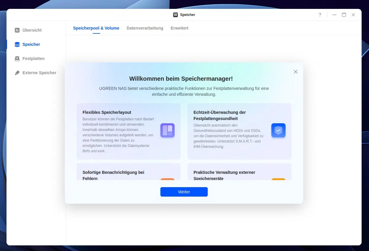 Dann geht es an die Einrichtung des UGREEN DH2300. Die Software führt euch Schritt für Schritt durch den Prozess und hilft euch dabei, die richtigen Entscheidungen zu treffen. Zunächst wird ein Speicherpool erstellt. Da ich zwei Festplatten mit je 4 GB im NAS nutze, habe ich mich für einen Raid 1 – Speicherpool entschieden. Den hat mir die Software auch empfohlen. Das bedeutet konkret, dass meine Daten 1:1 gespiegelt werden und auf beiden Festplatten verfügbar sind.