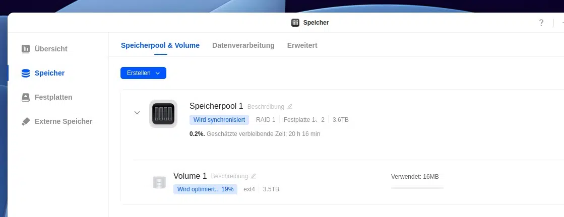 Nachdem der Speicherpool über die Software erstellt wurde beginnt das System zu initialisieren. Ihr könnt aber direkt weiter machen und müsst nicht auf die Beendigung des Prozesses warten. Das kann nämlich mehrere Stunden dauern und läuft praktischerweise im Hintergrund.