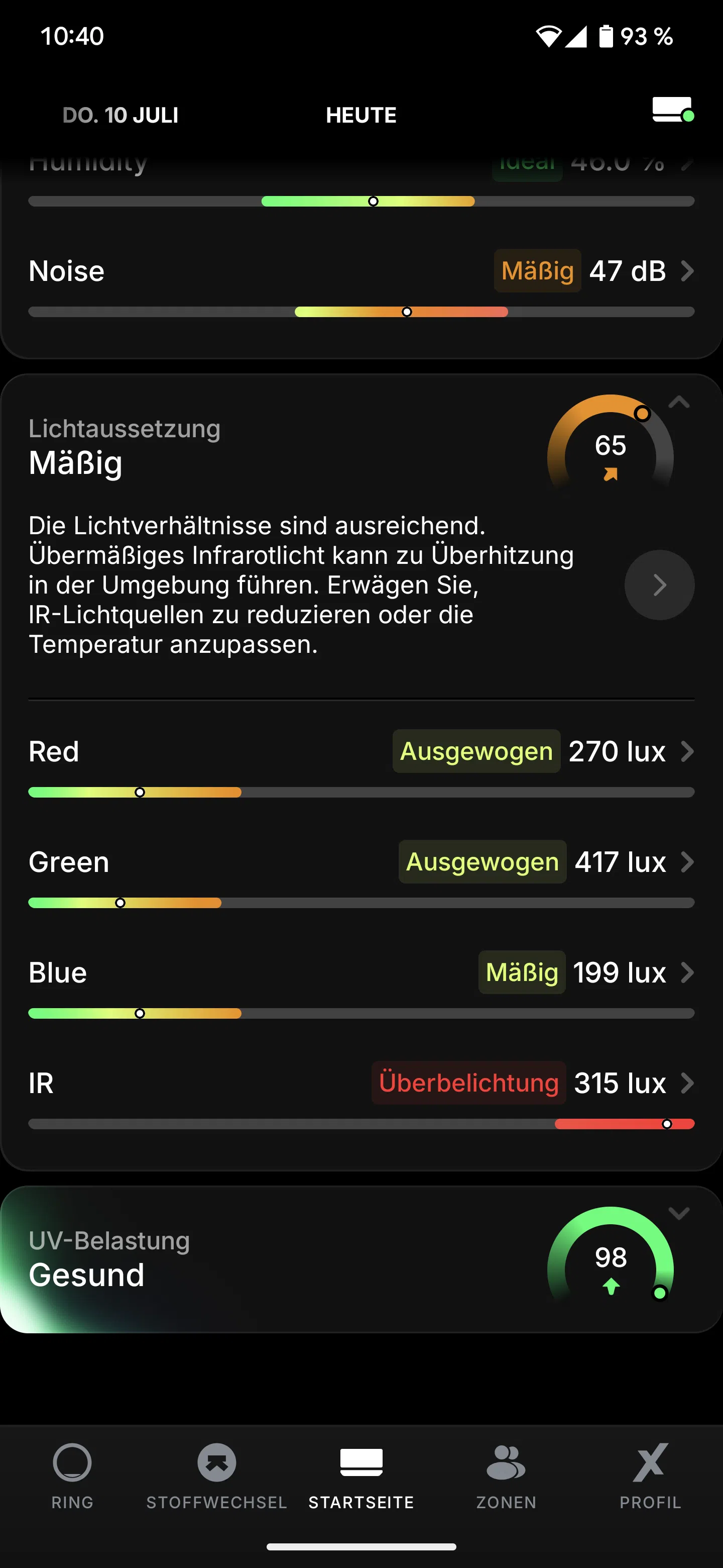 Nicht wirklich etwas abgewinnen kann ich dem Bereich Licht und UV-Belastung. Der Infrarot-Wert erschließt sich mir nicht ganz und die UV-Belastung ergibt im Innenraum nicht soviel Sinn. So ist das Gerät an sich für mich schon interessant und liefert anscheinend auch akkurate Werte.
