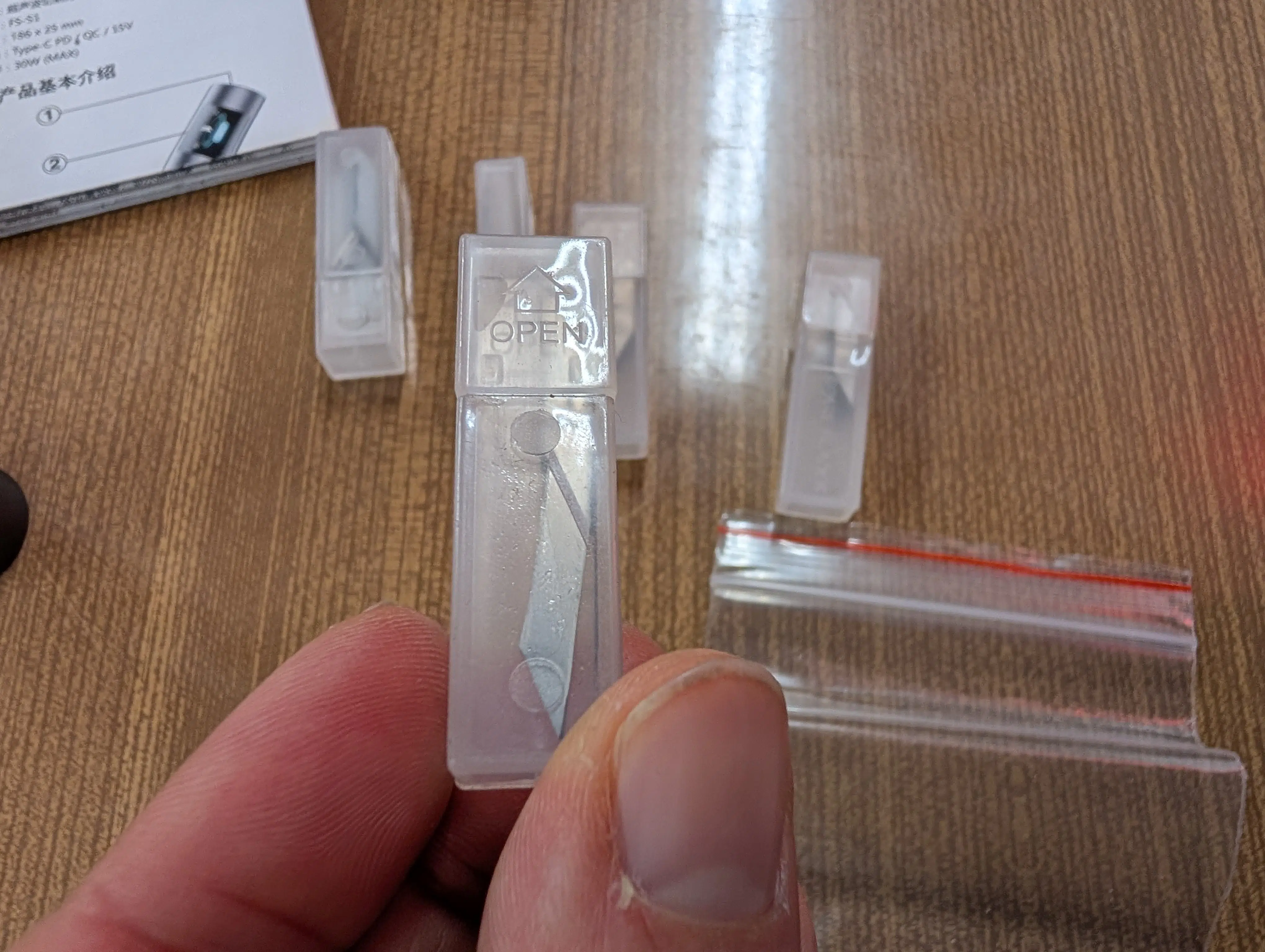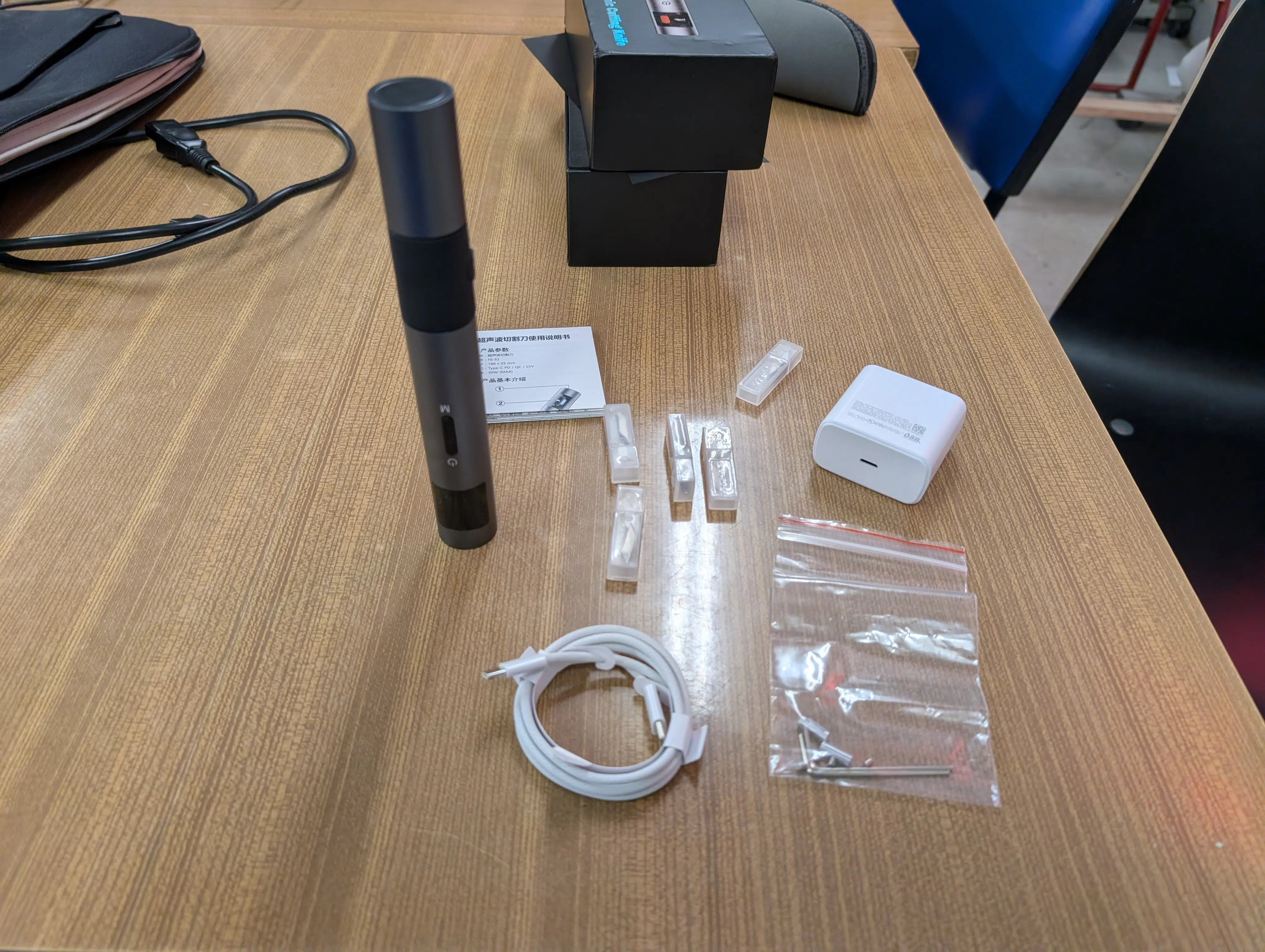 Der Ultraschall-Cutter kommt in einem schicken Karton zu uns und überrascht mit einer gerade in Bezug auf den Preis sehr guten Verarbeitungsqualität. Der Lieferumfang umfasst diverse Ersatzklingen in verschiedenen Stärken sowie Werkzeug zum Klingenwechsel, einen Quick-Start-Guide und ein USB-C-Kabel samt Netzteil.