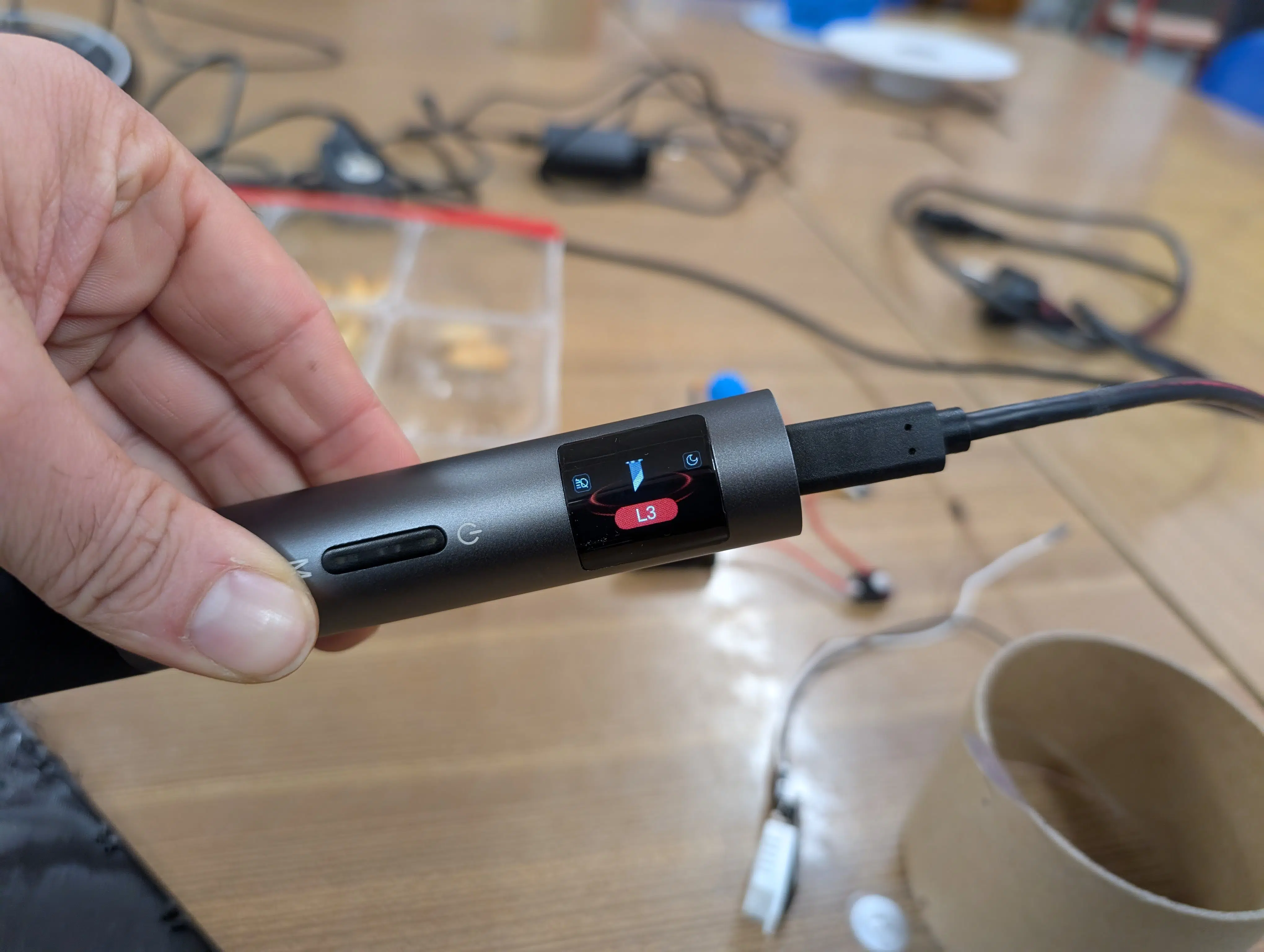 Das hier vorgestellte Modell verzichtet auf eine klobige Basisstation. Die gesamte Technik steckt im Handstück, das per USB-C (12V) mit Strom versorgt wird (eine starke Powerbank oder Netzteil ist Pflicht). Über Tasten am Gerät könnt ihr die Leistung in drei Stufen anpassen – von „Gentle“ für weiche Materialien bis „Strong“ für Carbon-Laminate oder dicke 3D-Drucke. Ein kleines Display zeigt den aktuellen Modus an, und eine LED an der Spitze beleuchtet den Arbeitsbereich.