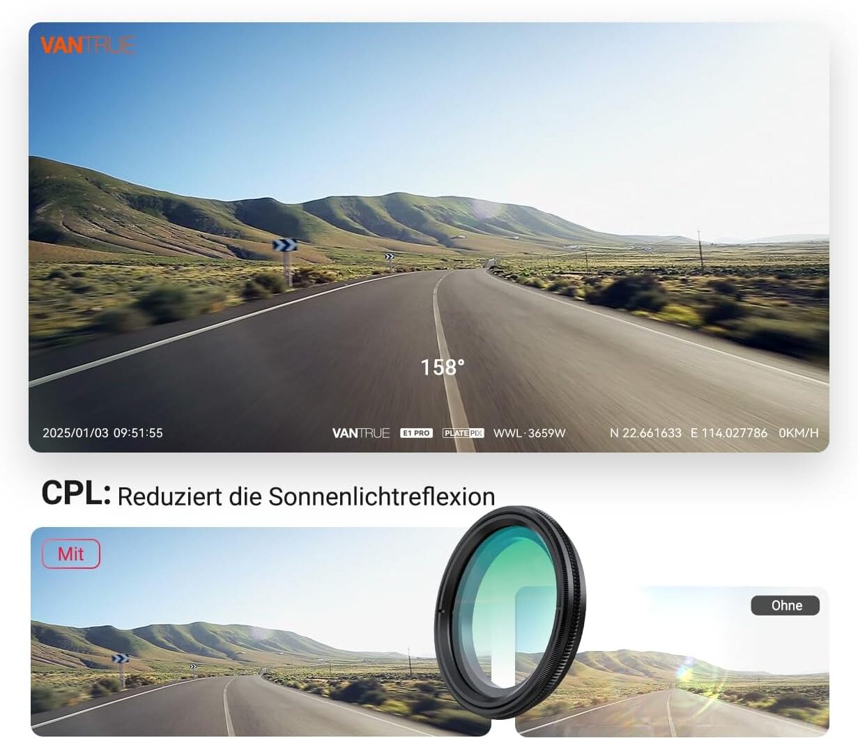 Ohne CPL sieht man im Video oft die Lüftungsschlitze (oder den Radio-Touchscreen) als Reflexion über der Straße schweben; mit CPL ist der Blick klar und kontrastreich. Dass Vantrue dieses essenzielle Bauteil direkt beilegt, verdient Applaus.