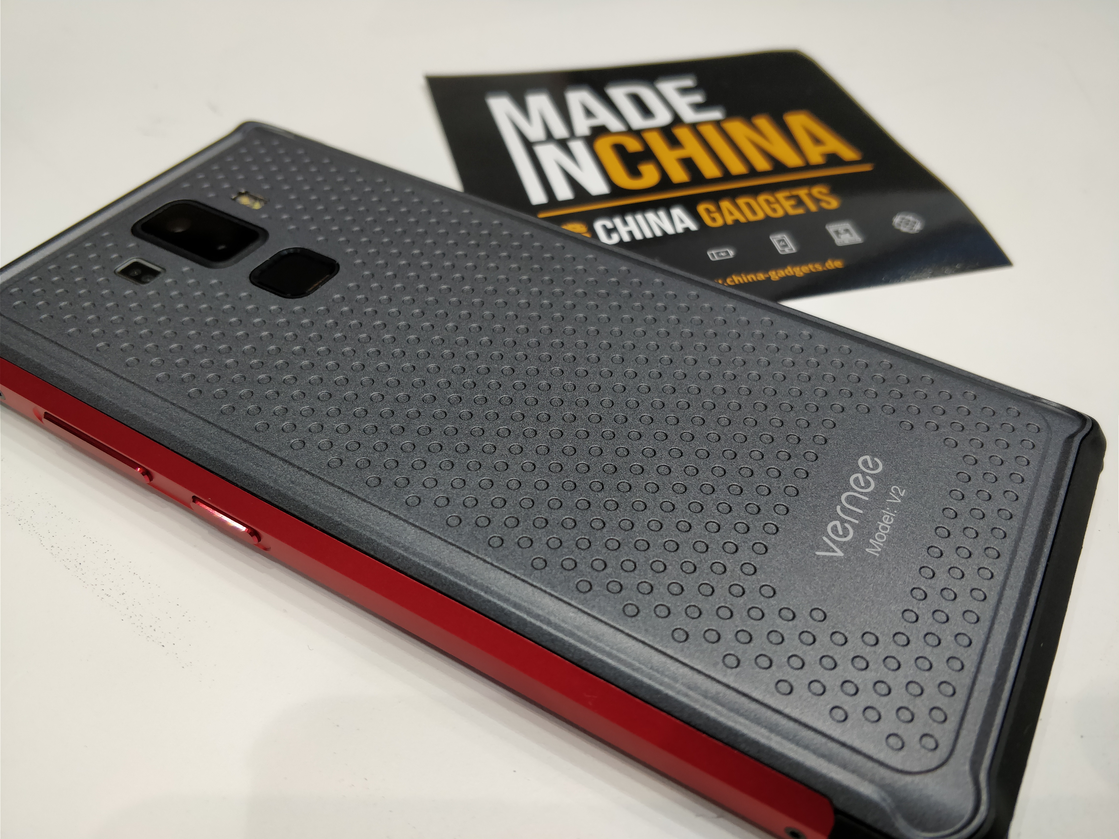 Schon der Vorgänger sah nicht unbedingt wie ein ganz klassisches Outdoor-Smartphone aus. Klar sah man auch hier noch, dass das Handy einiges einstecken kann, das Ganze war aber etwas schlichter verpackt. Diesen Trend setzt man nun beim V2 fort, indem keine klassische Metallrückseite mit vielen sichtbaren Schrauben, sondern eine schlichte, gepunktete Kunststoff-Rückseite verbaut ist. Diese Punkte sorgen in Sachen Haptik für einen guten Griff des Telefons. Damit geht Vernee einen guten Kompromiss zwischen Outdoor-Design und Alltagstauglichkeit ein! Ebenso sind auch die seitlichen Ränder wieder aus Metall (in rot oder schwarz) während oben und unten ein gummiartiger Kunststoff zum Einsatz kommt.