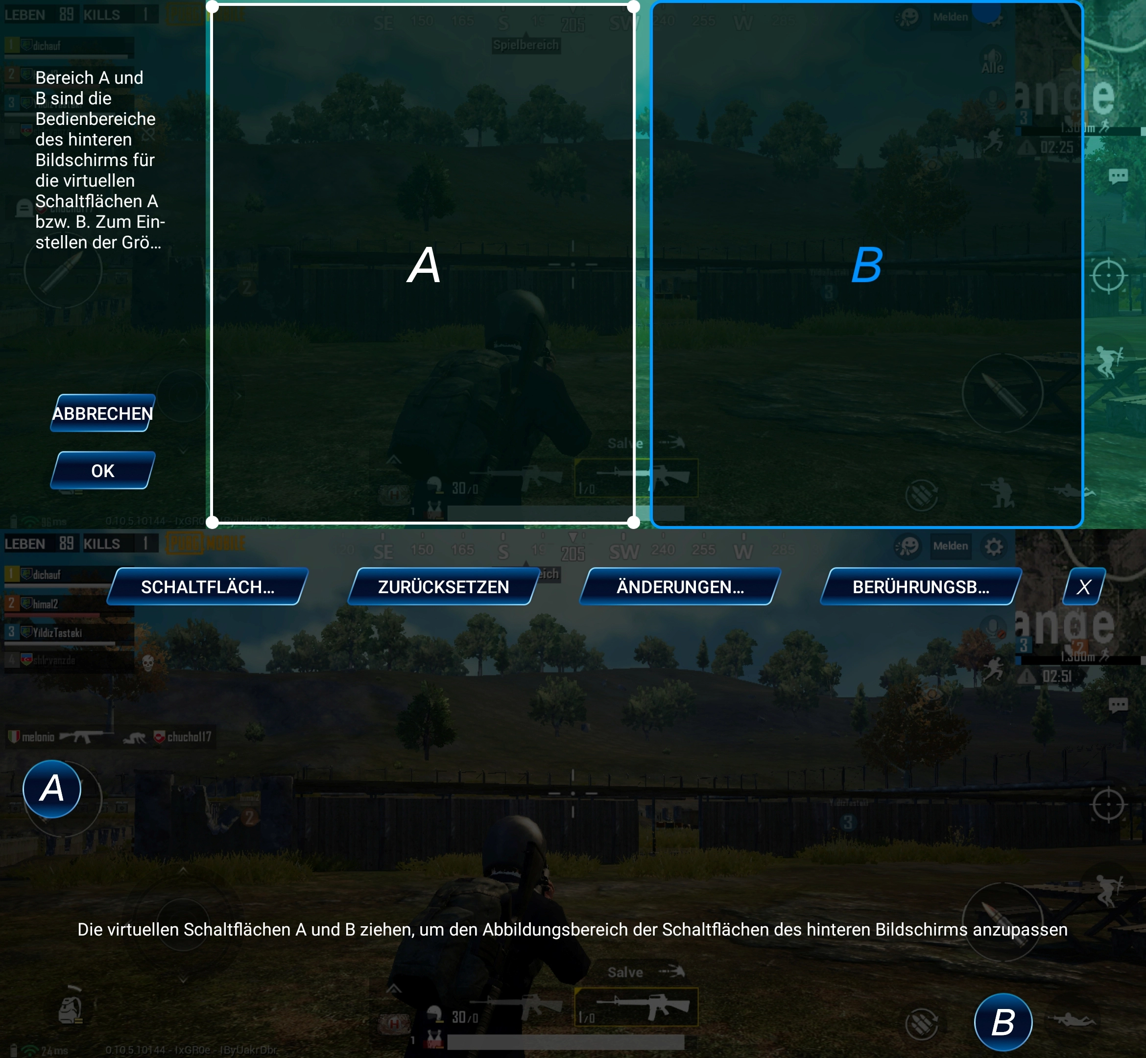Es gibt auch noch ein Gaming-Feature des sekundären Bildschirms. Dabei wird dieser in zwei Bereiche geteilt (A und B). Auf dem vorderen Bildschirm gibt es dann zwei dazu passende virtuelle Tasten, die man über die In-Game-Tasten legen kann. Berührt man nun den linken A-Bereich des hinteren Bildschirms, wird die virtuelle Taste gedrückt. So konnte ich z.B. in PUBG mit A schießen und mich mit B ducken. Hier hat Vivo dem Nubia X etwas voraus.