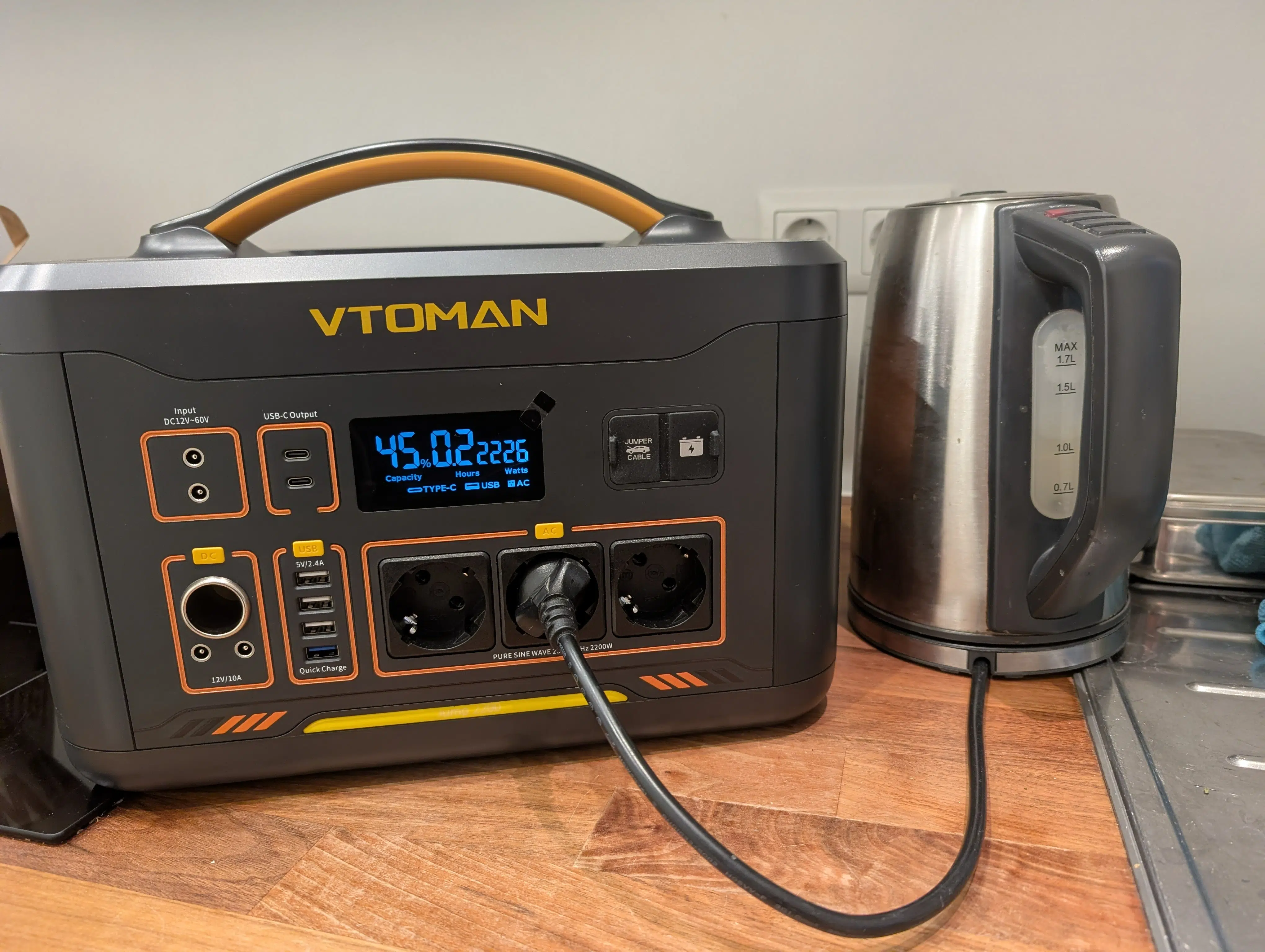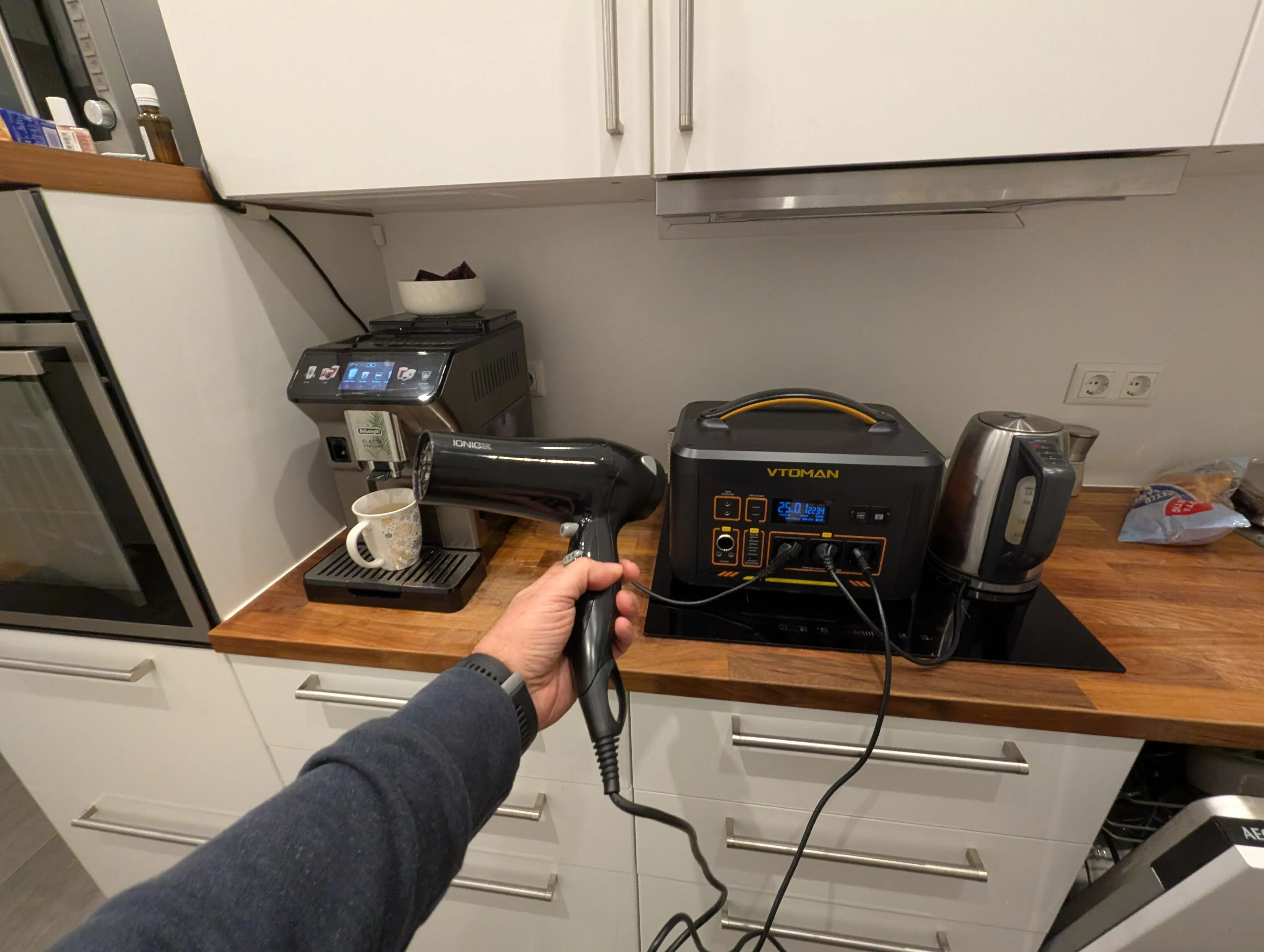 Ein einzelner Wasserkocher (2226 Watt) beeindruckt die Powerstation gar nicht. Also haben wir es auf die Spitze getrieben: Wasserkocher, Kaffeevollautomat (mit hohem Anlaufstrom) und Föhn gleichzeitig. Das Ergebnis: 2234 Watt Dauerlast und Spitzen bis 3250 Watt. Die Leistung brach zwar beim Wechsel der Föhnstufen immer kurz ein, aber die Powerstation schaltete nicht ab. Chapeau! Die Herstellerangaben sind also keine Fantasiewerte.