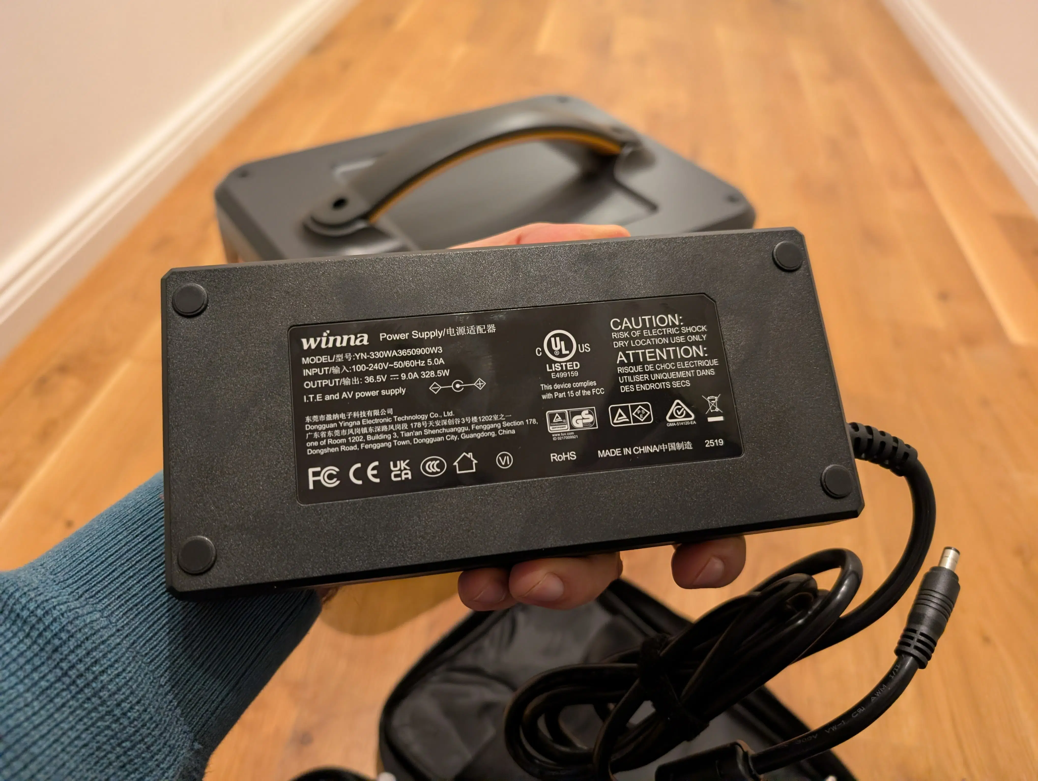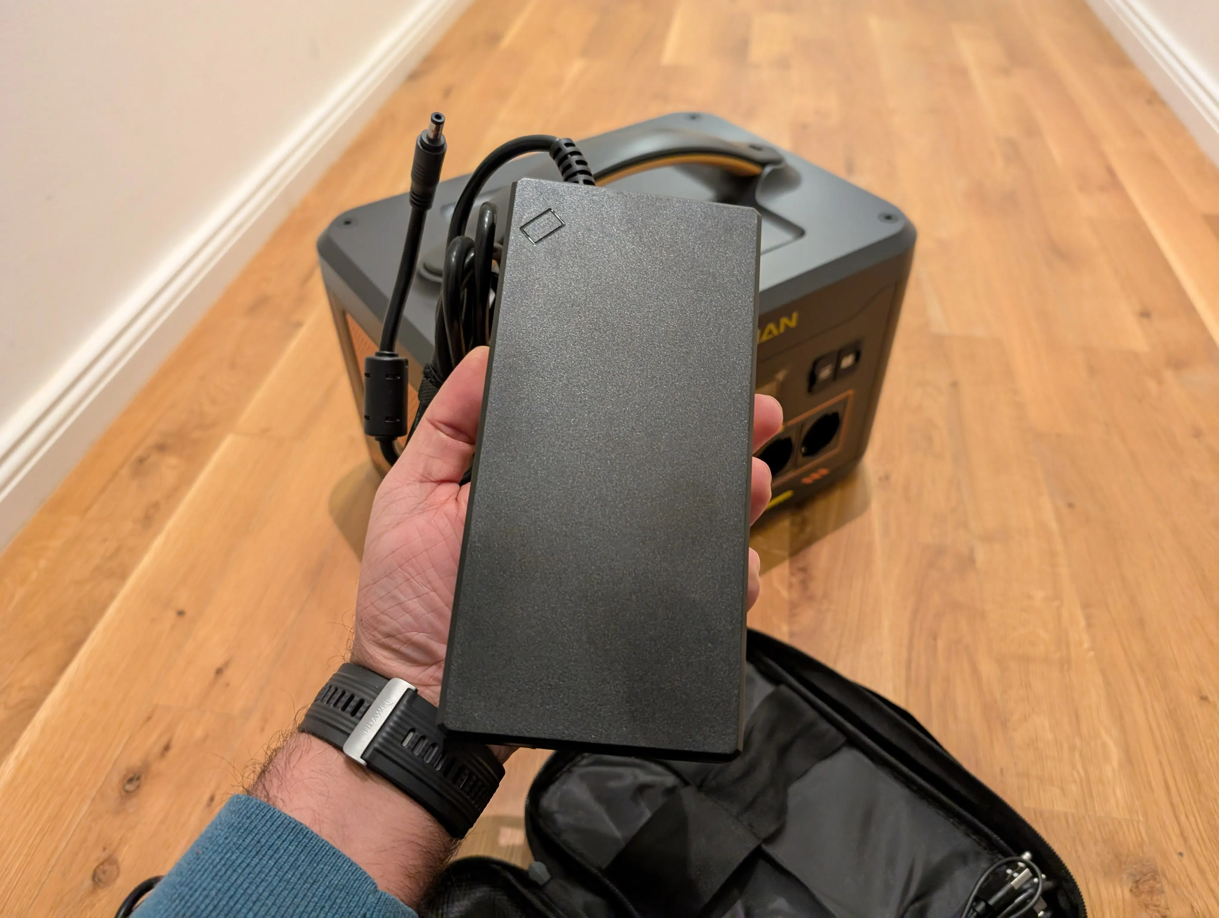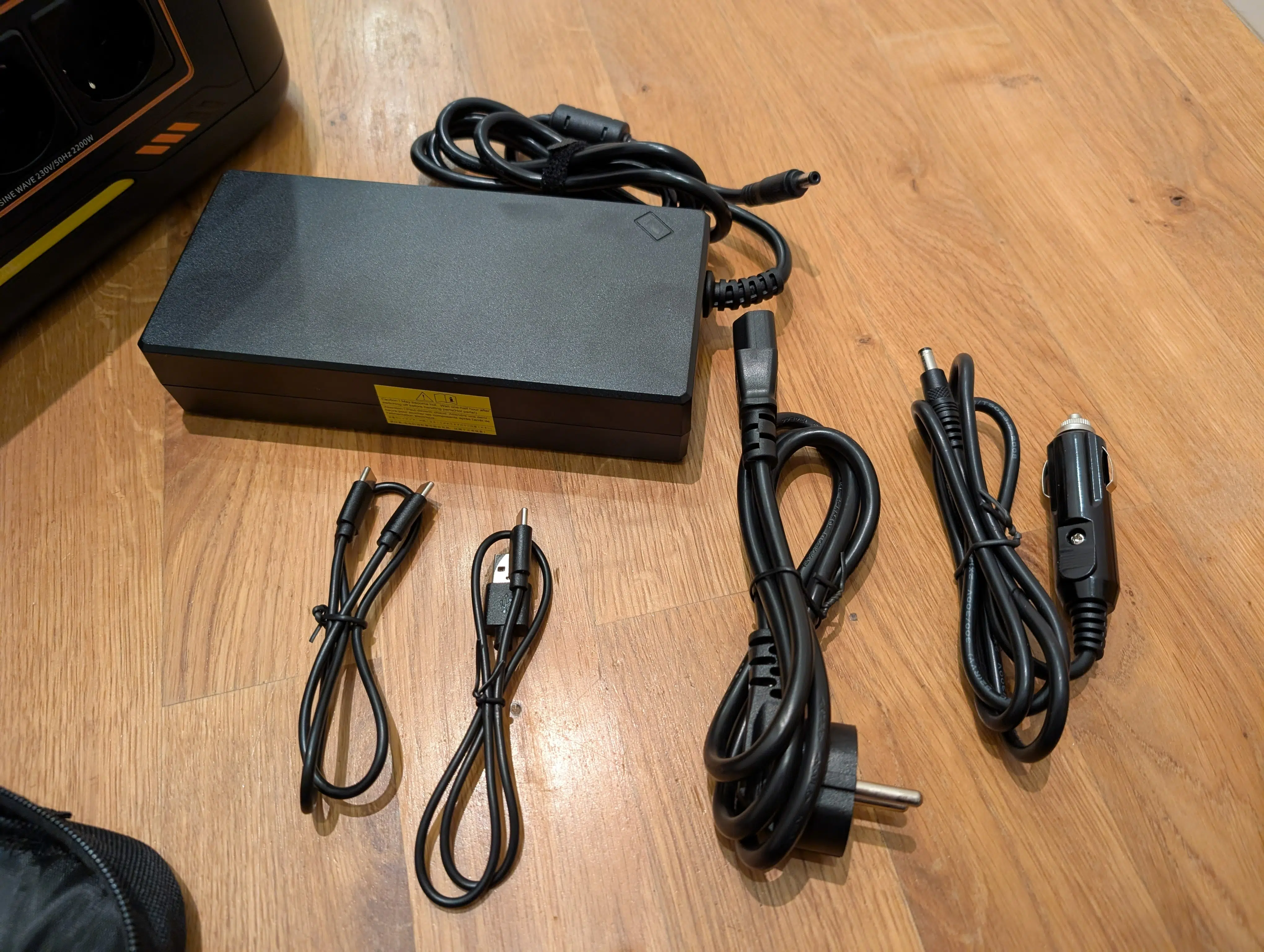 Der Lieferumfang ist – freundlich gesagt – überschaubar. Neben ein paar Stickern und einer Tasche finden wir das wohl größte Netzteil, das uns je untergekommen ist (über 300W Output!). Dazu gibt es ein Kaltgerätekabel, ein KFZ-Ladekabel und zwei kurze USB-Kabel.