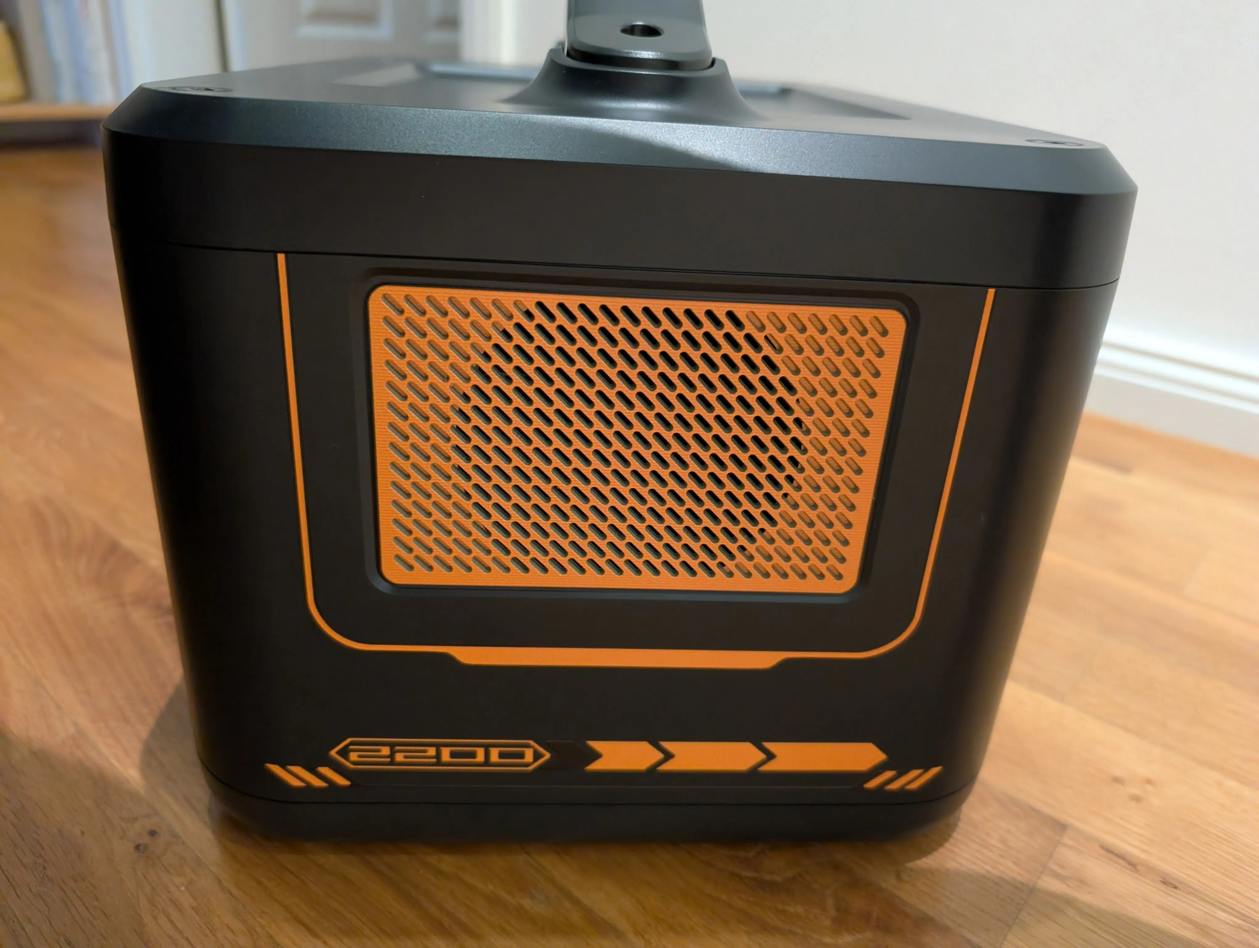 Schon beim Auspacken wird klar: Die VTOMAN Jump 2200 ist kein Spielzeug. Mit 17,5 kg ist sie ein ordentlicher Brocken, der dank des grau-orangen Kunststoffgehäuses eher nach Baustelle als nach Campingplatz aussieht. Der zentrale, starre Tragegriff macht sie leider nicht stapelbar, aber robust.