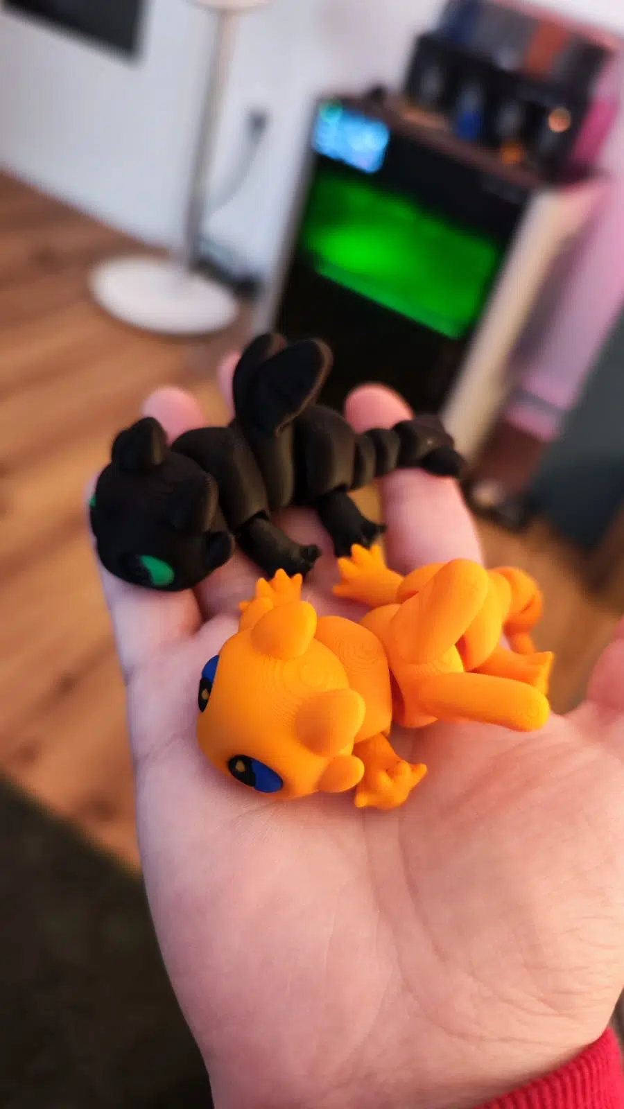 Ein Vorschlag aus den Kommentaren des ersten Artikel: Flexi-Figuren. Ich musste dieses Modell tatsächlich schon mehrere Male ausdrucken, weil es wirklich sehr gut ankam. Der süße Drache erinnert stark an „Drachenzähmen Leicht Gemacht“ und ist im groben Sinne für mich auch wie ein Fidget Toy, denn man spielt wirklich viel damit herum. Einziger Nachteil bei dieser Vorlage: die Pupillen der Augen haben immer die Farbe des Körpers, was nicht in jeder Farbkombination unbedingt cool aussieht. Auch ein Übermalen mit Acrylfarben geht hier natürlich auch, sieht aber einfach nicht so schön aus, dank der Einkerbungen des Drucks an sich.