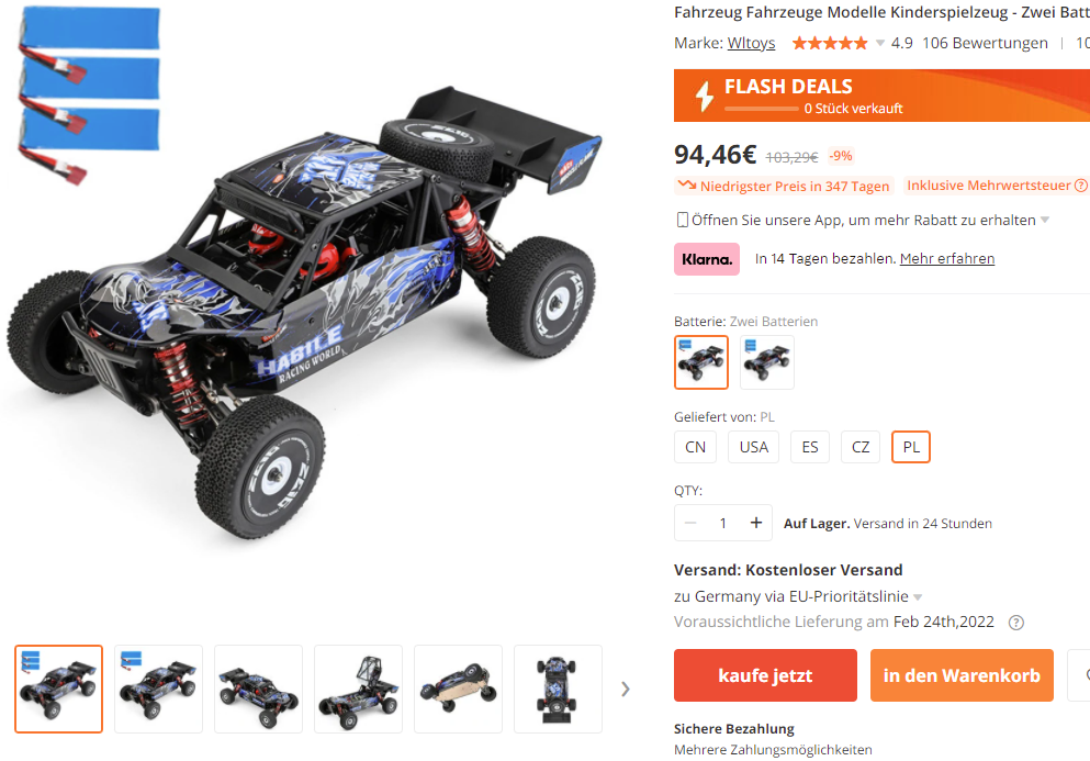 der RC Buggy mit 3 Akkus ist im Moment ausverkauft. Du kannst aber den RC Buggy mit 2 Akkus für 83,18€ nach Österreich liefern lassen. Wähl dafür das PL-Lager und benutze für den Preis den Gutschein: BG8ac348.
