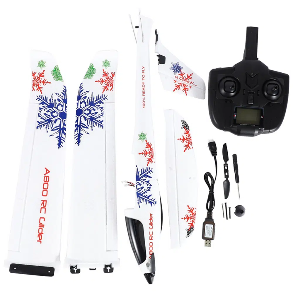 Im Lieferumfang des WLtoys XK A800 RC-Glider sind der Flieger selbst, die 2,4 GhZ-Fernsteuerung, ein 2S 7,4V 300 mAh Akku, ein USB-auf-Balancer-Ladekabel sowie eine Ersatz-Klappluftschraube samt Schrauben und eine Bedienungsanleitung.